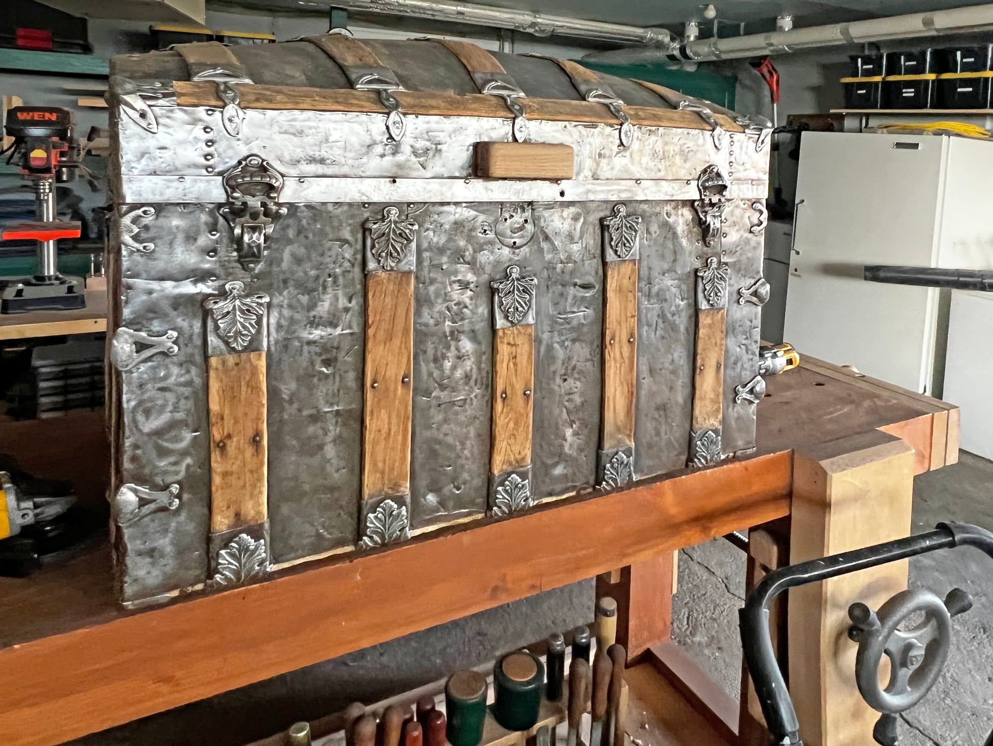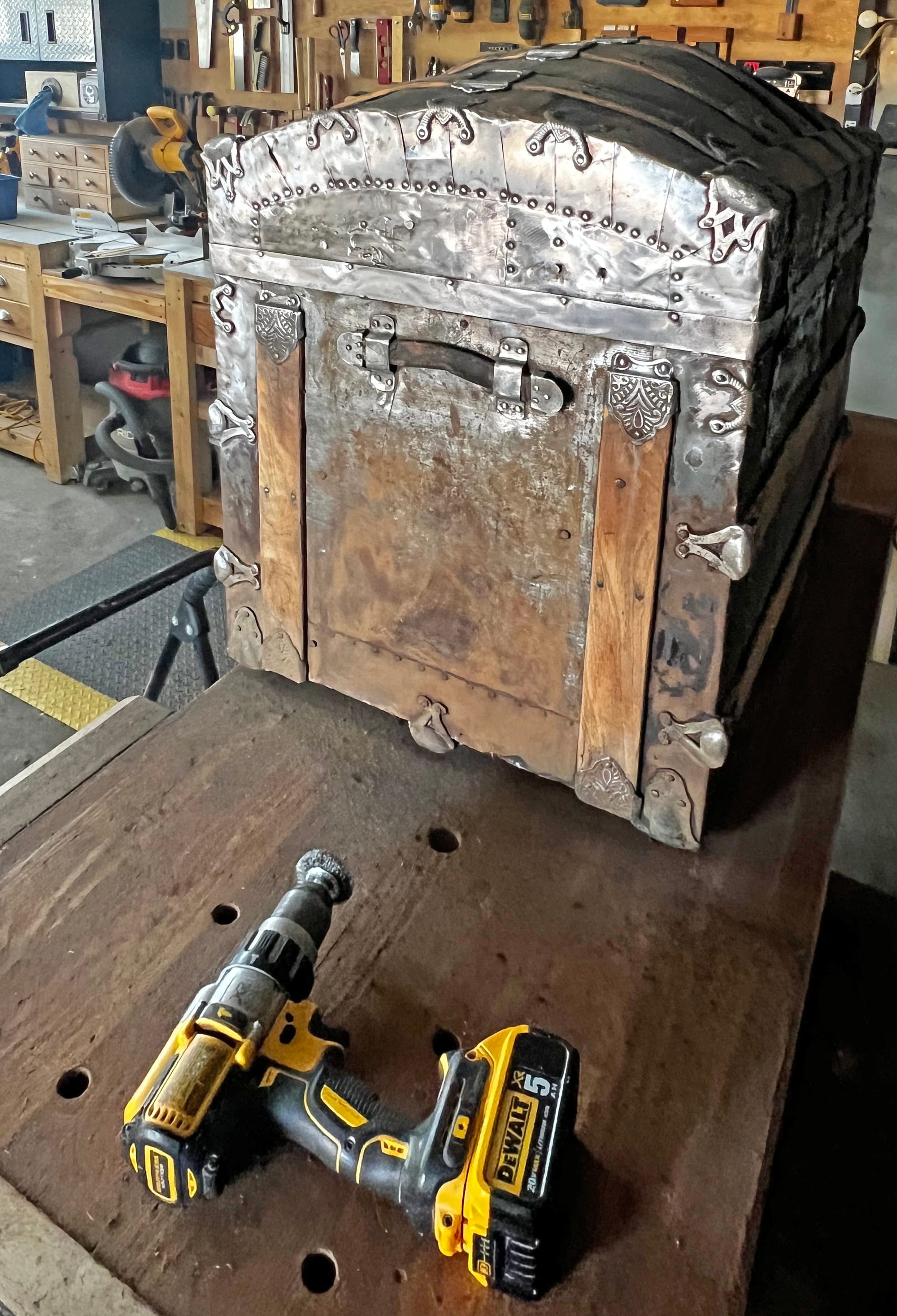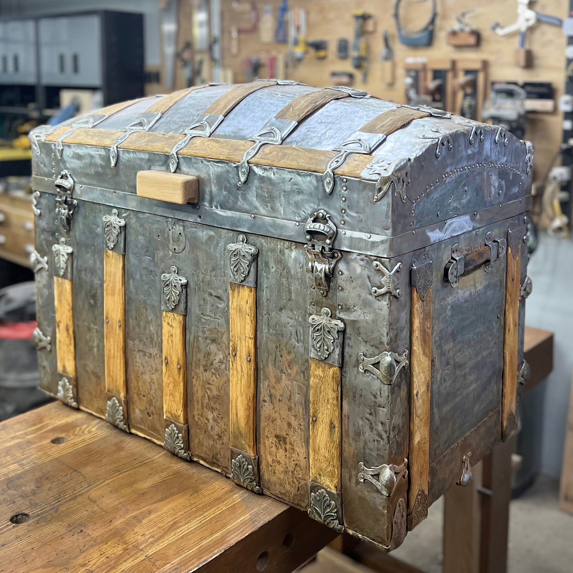 I bought it for $80 from a neighbor. It was a filthy rusty mess, and they think it had been stored in the basement of their house for a long time, perhaps since around the time of that house's construction in 1912. I've looked through a bunch of websites/articles/videos about antique steamer trunks, and based on details of this one's construction here's what I think I know: