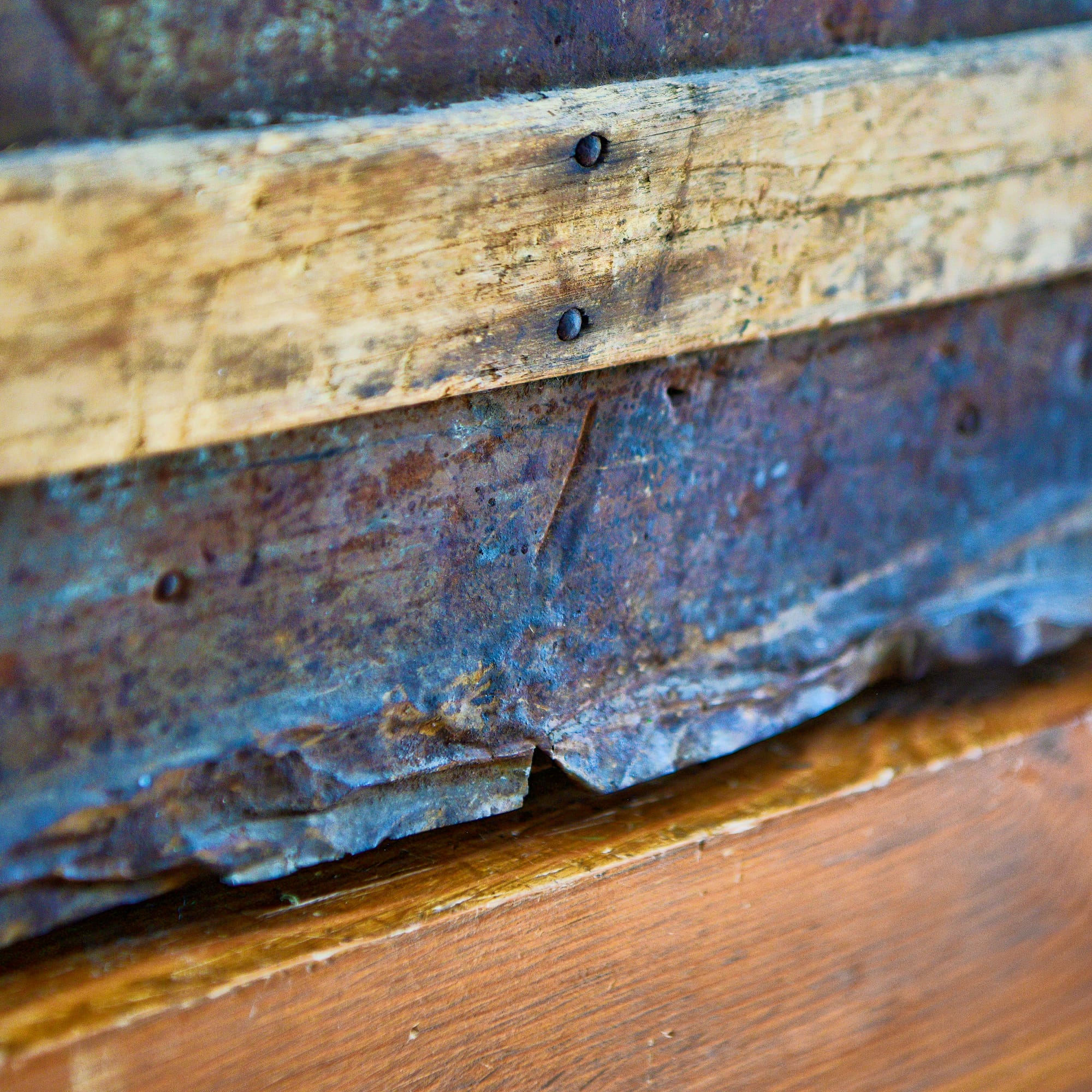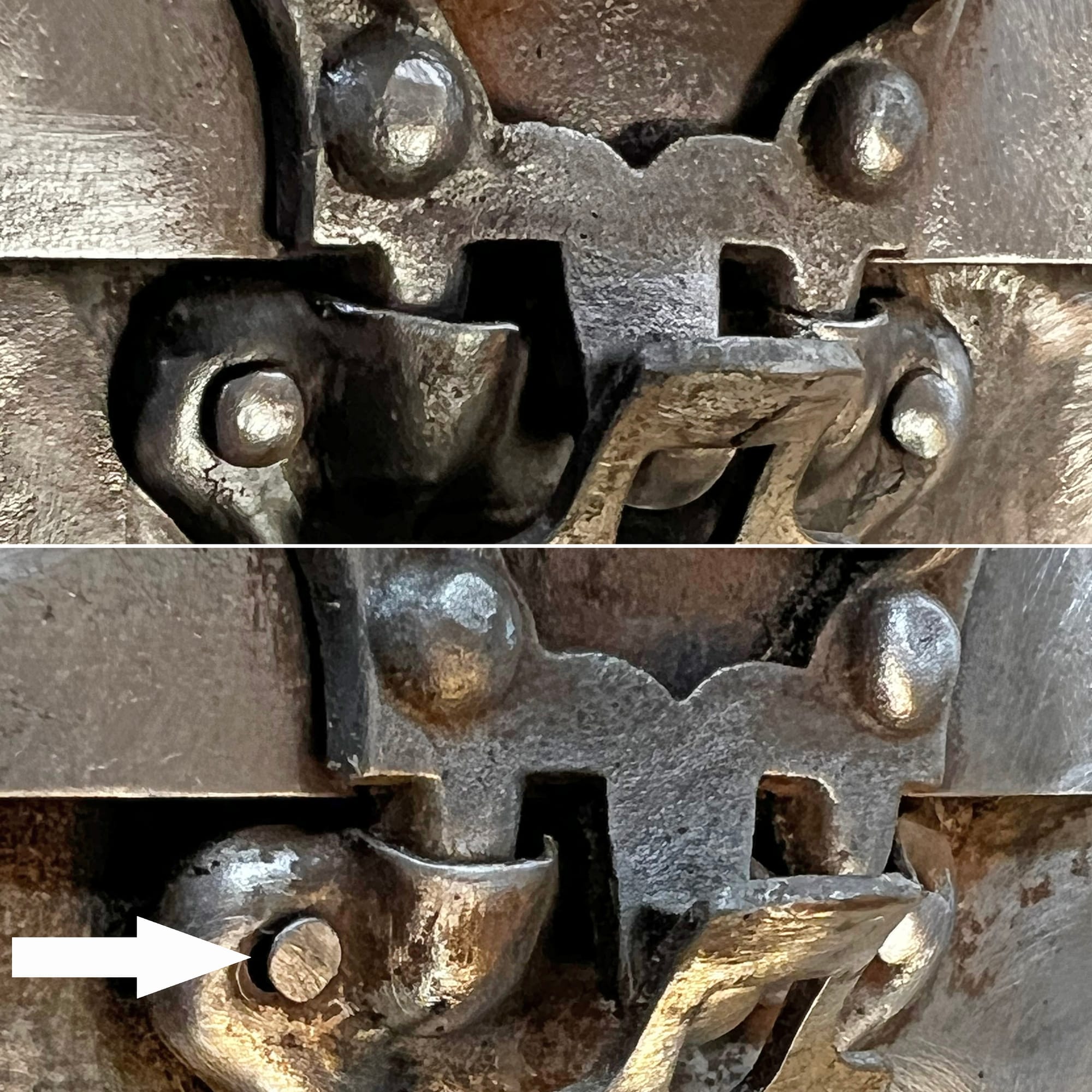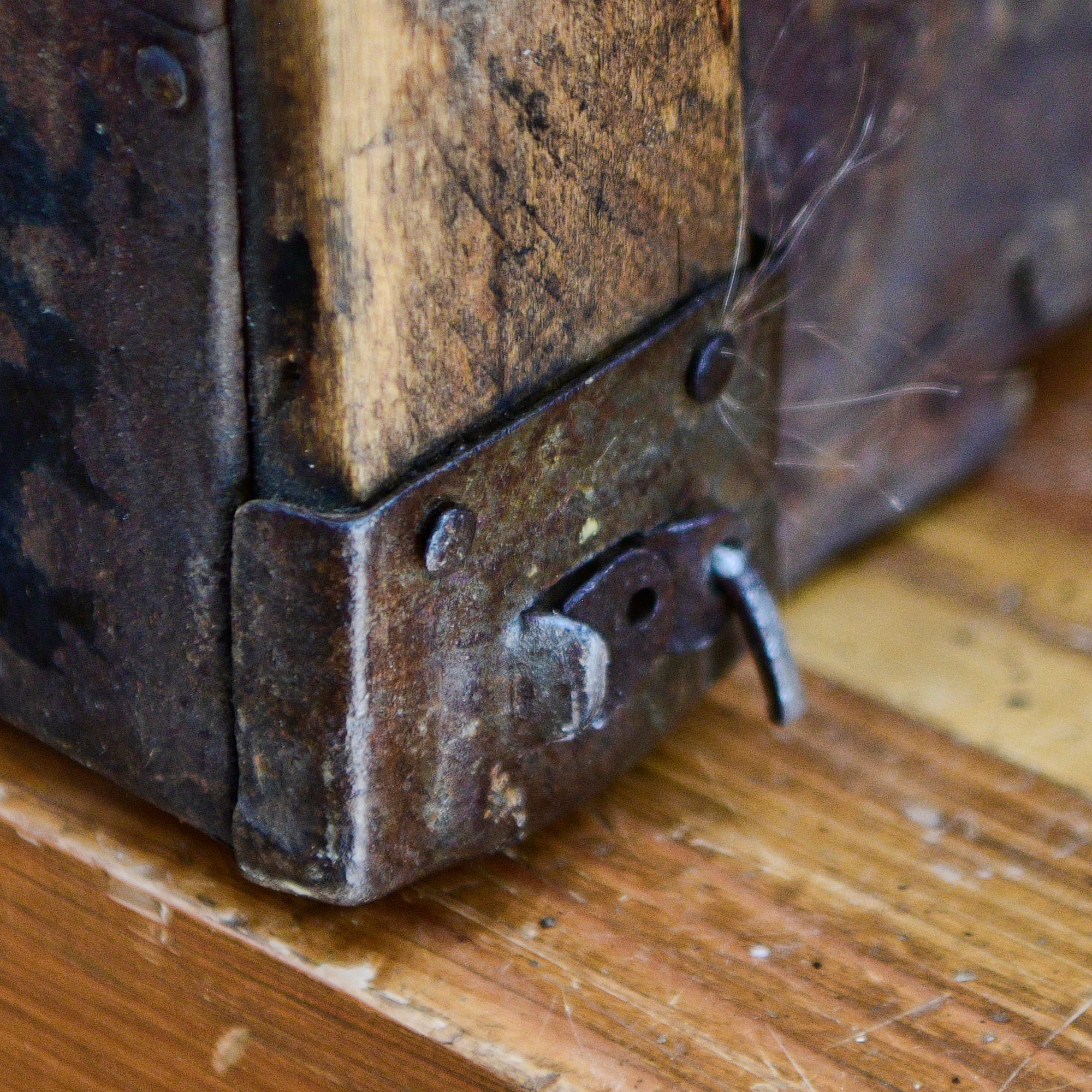 All of the hardware is secured with old-fashioned rounded-head square-tipped nails. Some of the nails are missing, and in some cases those spots have been repaired with modern flat-head nails as shown on the right. I found a small supply of the original style of nails on Ebay, so those are on the way and I'll use them to restore the original look to all the hardware.