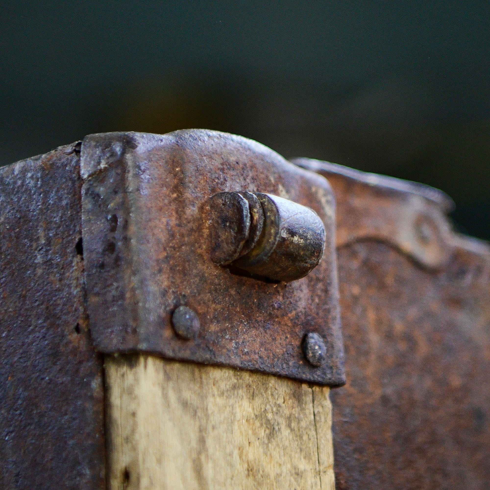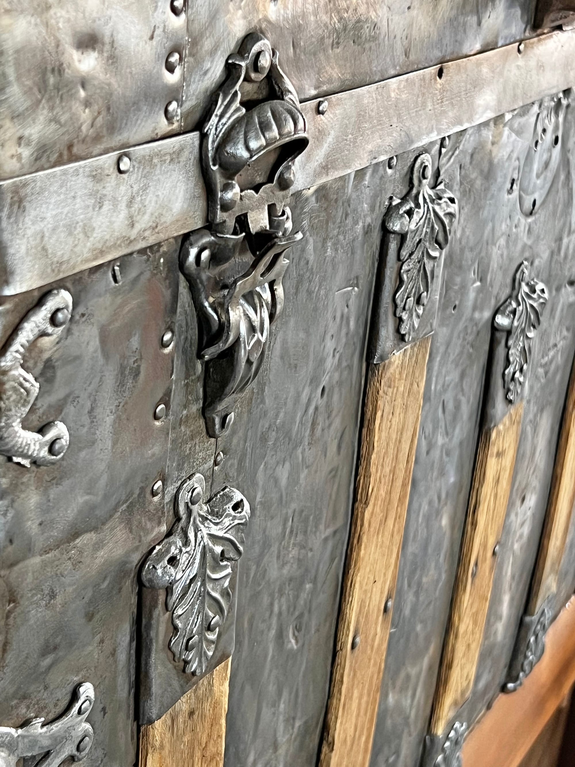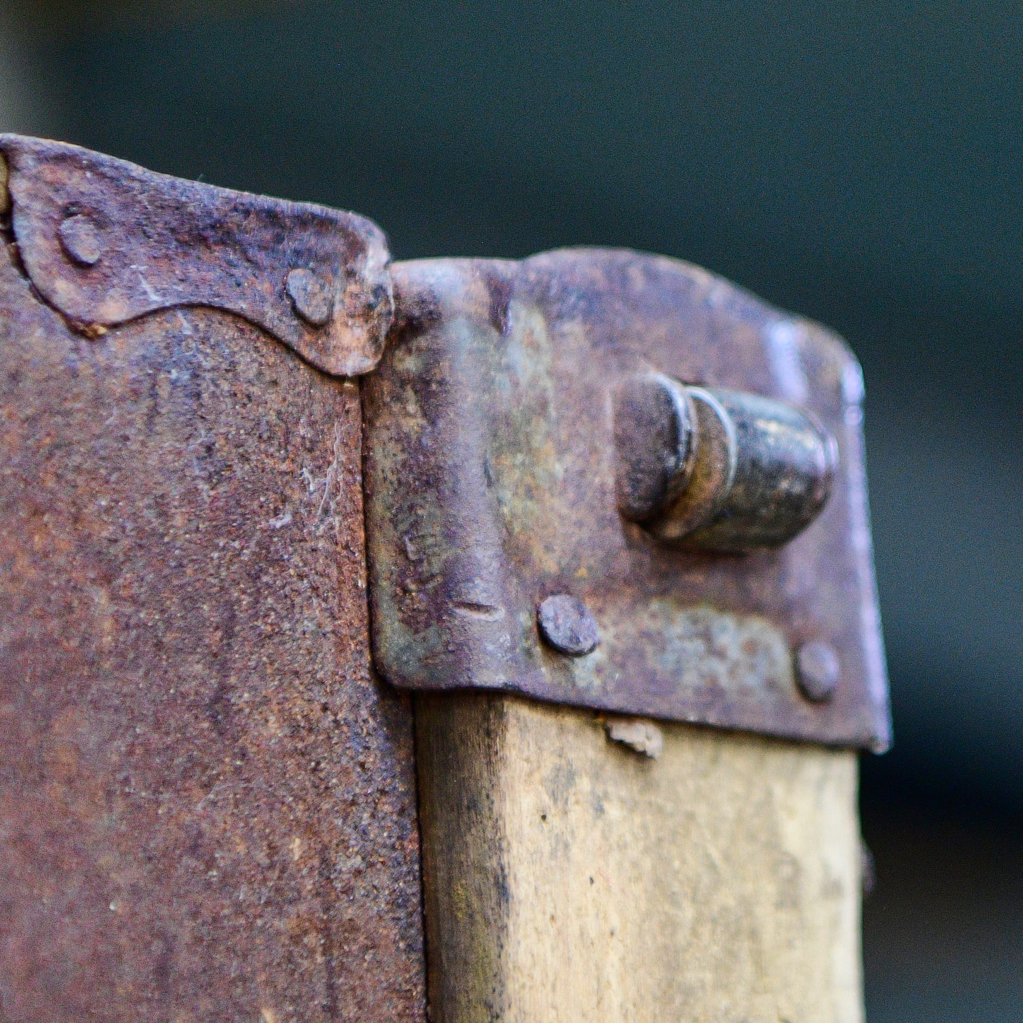 All of the hardware is secured with old-fashioned rounded-head square-tipped nails. Some of the nails are missing, and in some cases those spots have been repaired with modern flat-head nails as shown on the right. I found a small supply of the original style of nails on Ebay, so those are on the way and I'll use them to restore the original look to all the hardware.