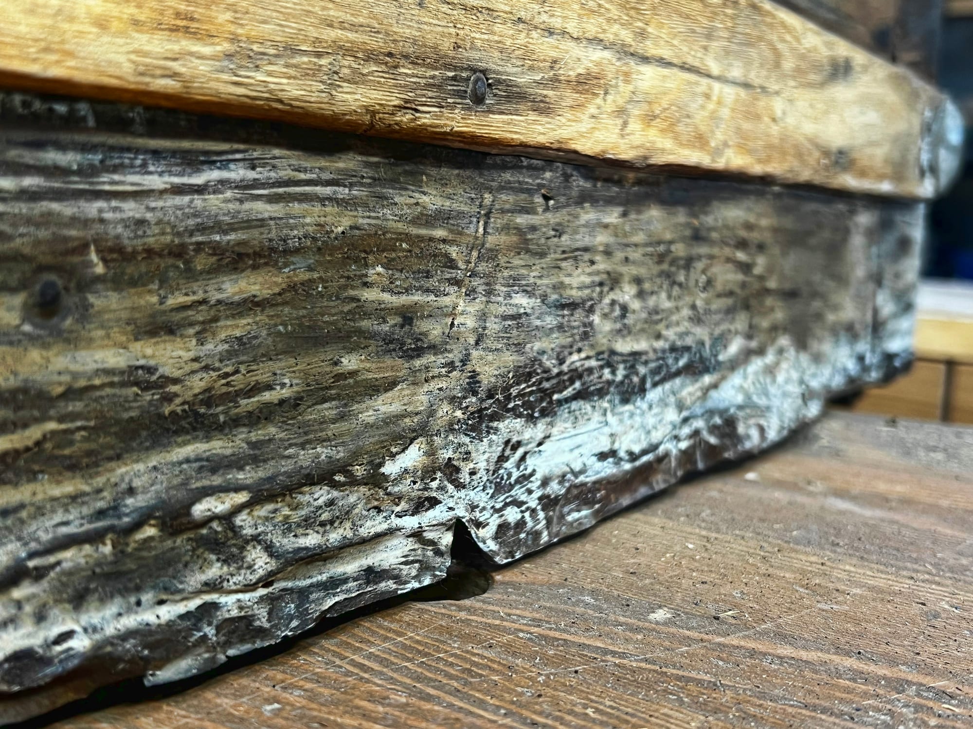 - Next will be dealing with the base: making it sturdy and sealing it up. To do that, I'm going to build a custom stand to hold the trunk upside-down without damaging the humpback top, and it will sit upside-down like that until the base is done.