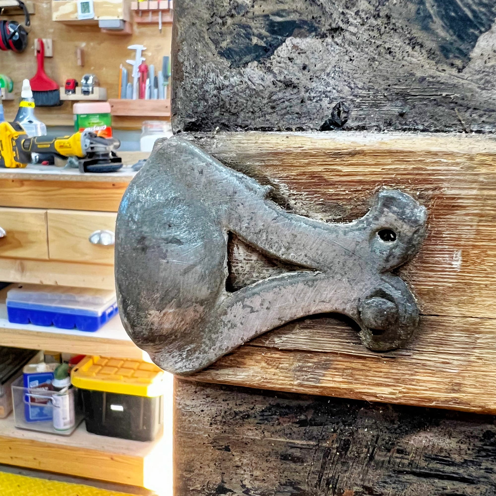 There are many dangerously sharp spots on the exterior. I'm pounding and filing some of them smooth, but the base is rusted out and jagged all around, so I'm going to build some hardwood trim to go around the bottom edge to make it smooth and clean and safe.