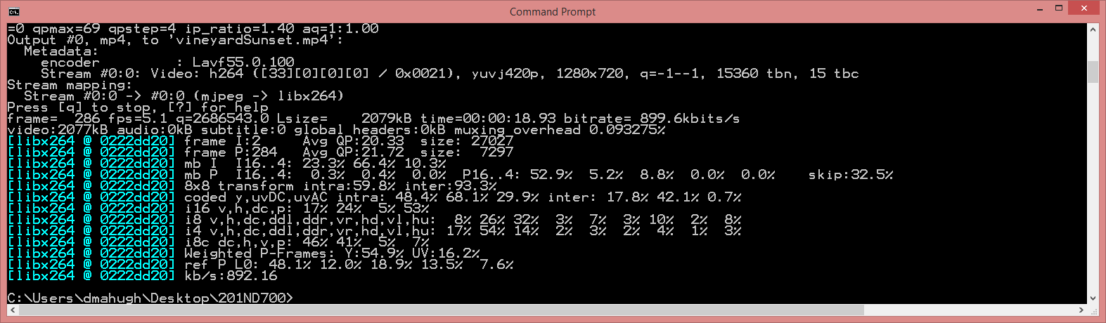 After I typed a command like that for the example in this post, FFmpeg ground away for about a minute and then stopped: