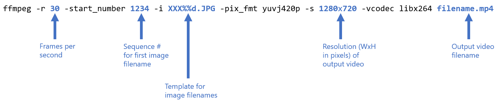 FFmpeg assumes that your filenames contain a sequential number within a template, which is a fair assumption for pretty much any digital camera in existence. In the example above, the first image filename would be XXX1234.JPG, following by XXX1235.JPG, and so on. If your number series contains leading zeroes in the sequence numbers, you'll need to use a format such as XXX%04d.JPG.