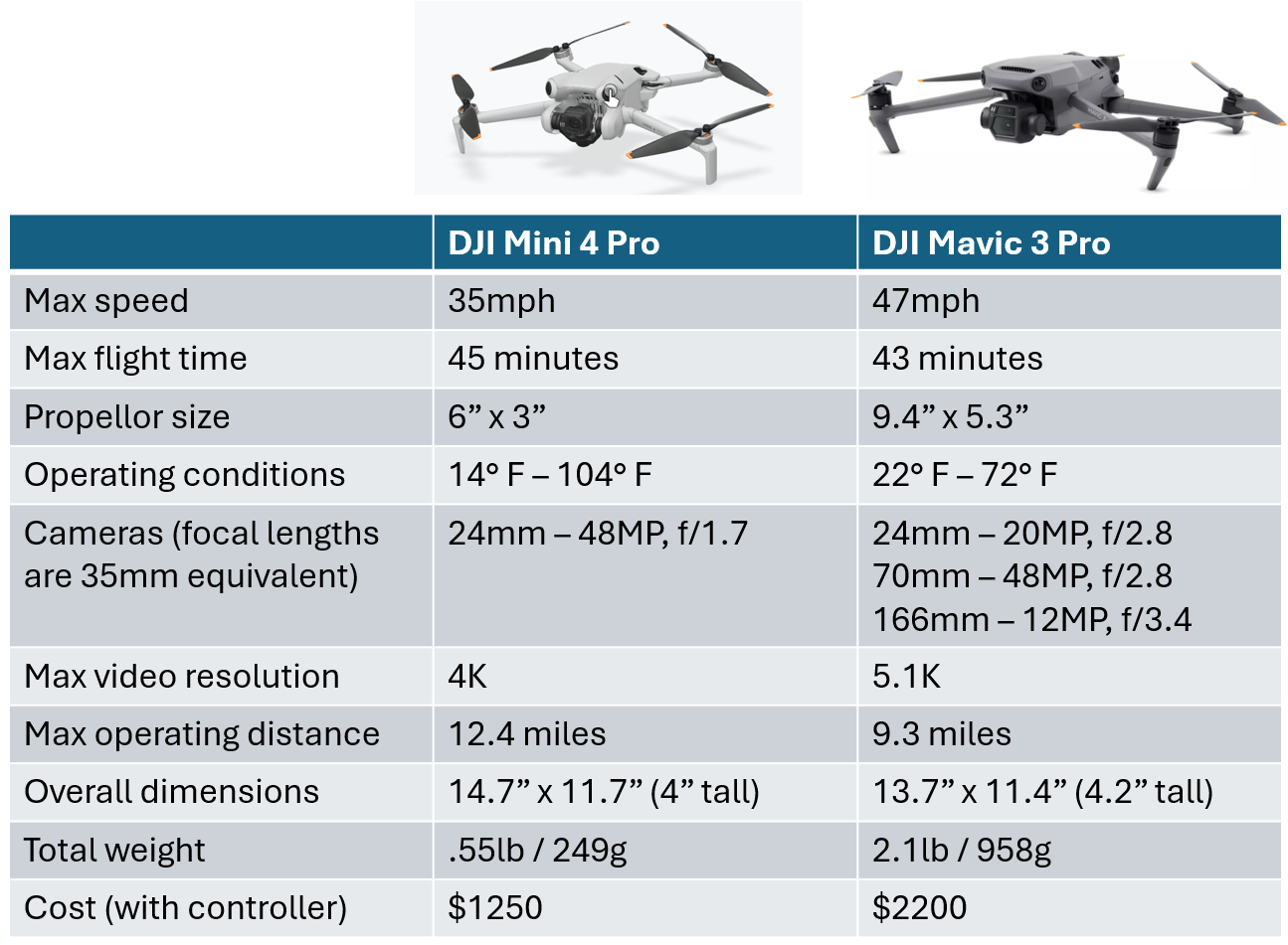 Either one looked like a great choice, and in the end I decided to go with the Mini 4 Pro. The Mavic 3 Pro's combination of cameras was tempting, and it would be nice to have a quality telephoto lens on a drone. But I'm going to be in the "learning the basics of flying a drone" stage for a long time, so I decided to go with the smaller, lighter, and less expensive option. Is a Mavic 3 Pro or its successor in my future? Never say never, but I'm good for now drone-wise.