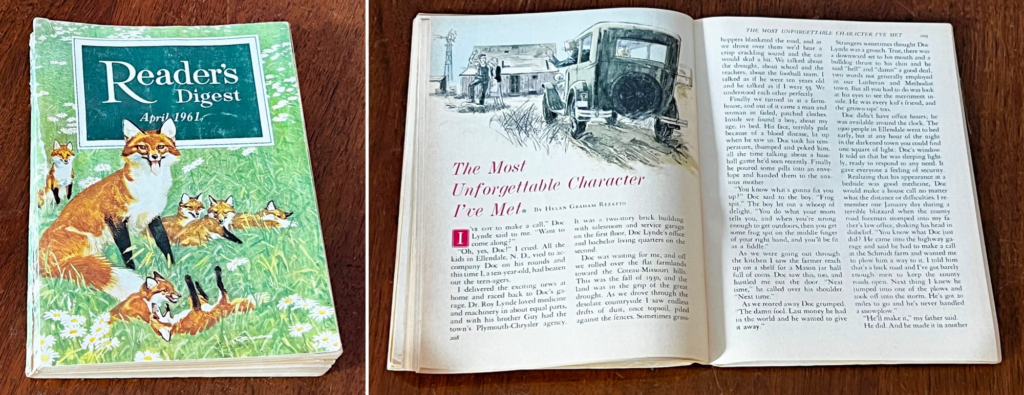 In April 1961, my great-great-uncle Dr. Roy "Doc" Lynde was featured as The Most Unforgettable Character I've Ever Met, in an article written by Helen Graham Rezatto. I recently tried to find an online copy of this article, but the only transcriptions I've found are low quality (full of typos and omissions), or scanned PDF versions that are hard to read. So I decided to create this blog post, which includes an accurate transcription of the article.