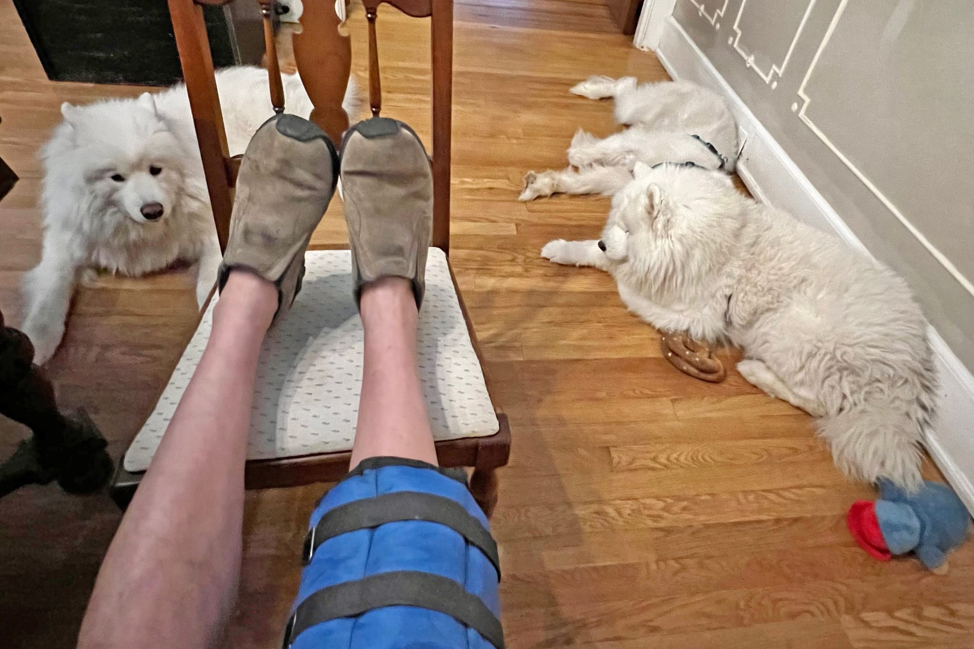 I had more swelling than I should have at this point, and that appeared to be caused or at least exacerbated by the exercises I was doing. So Dr. Stenger increased my blood thinner meds and told me to focus on bed rest, ice, and elevating my knee above my heart until four weeks after surgery, when I would start PT sessions again with Kevin.