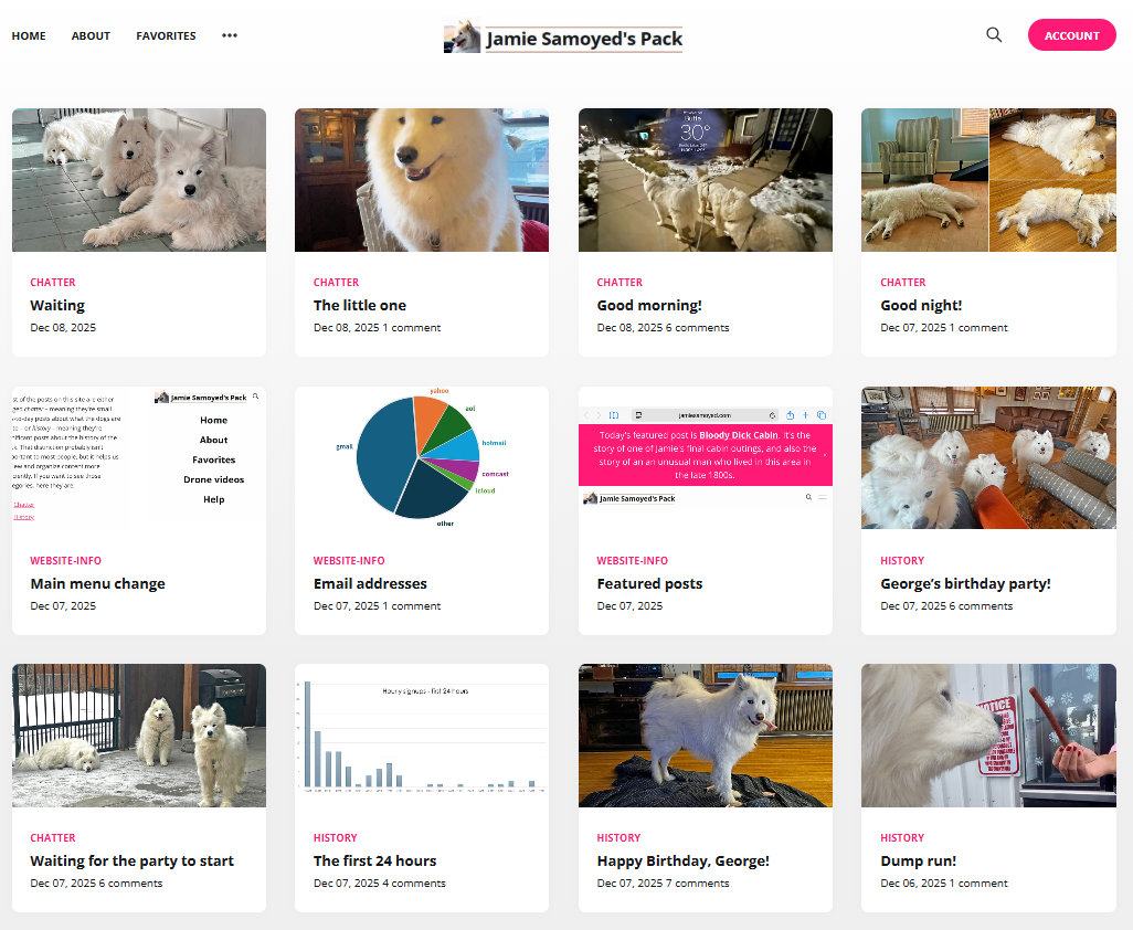 The site went live over the weekend, and it's at jamiesamoyed.com. It's about our dogs, and nothing else. Like the Facebook group it is replacing, it will have posts every day, usually many times a day. It's hosted by Ghost, like this blog, although it has some differences because of the difference in the pace of posts. Among other things, the layout is different, and it doesn't send out email notifications for each post because I feel like that would practically cross the line into online harassment some days.