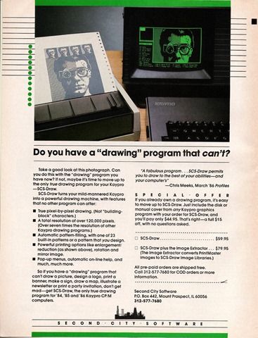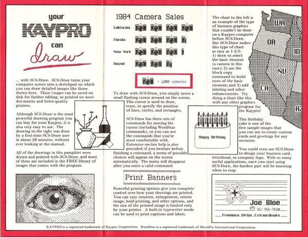 I attribute my success as a programmer today to having to “make things work” with a Kaypro, and SCS-Draw was a vital component of what kept my output from looking too far behind my peers.
