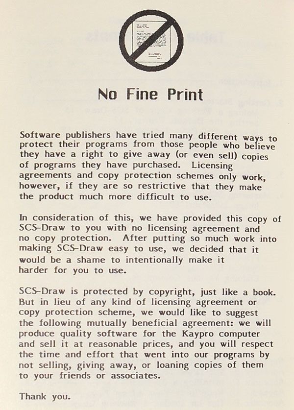 I had a single registered SCS-Draw user in Little Rock, Arkansas, but I received several support calls and letters from Little Rock. I handled them all as if they were paying customers, but I knew something wasn’t right. Years later, I heard from an SCS-Draw user in Little Rock who had gotten the program at a local user group meeting, where a disk was available for duplication as needed. Apparently they hadn’t read the "No Fine Print" page.