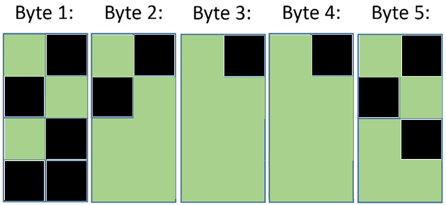The values of those bytes are determined by setting bits that correspond to each of the pixels, per rules that are well documented to this day by Skookum Pete. Each 2×4 block of pixels was represented by a single byte in memory, and each time a pixel changed between black and green you had to go through several steps including determining the row/column of the 2×4 block of pixels containing this one, getting the current value of that byte, figuring out how it needs to be modified, and writing the new value out.