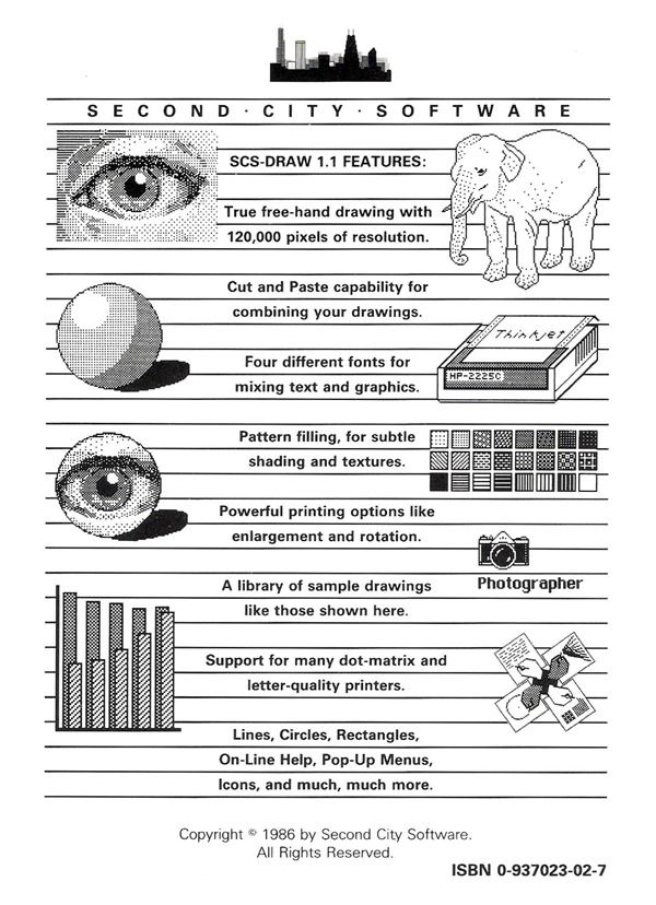 I included a summary of SCS-Draw’s functionality on the back cover of the package (which was designed by my friend Jeff Hapner, graphic designer extraordinaire):