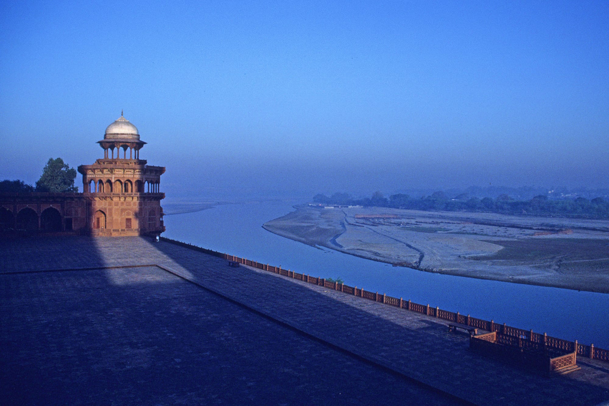 The view across the Yamuna River from the back side of the Taj Mahal, and a boy with a goat on the far side of the river near the Dalit village of Nagla Kachpura.
