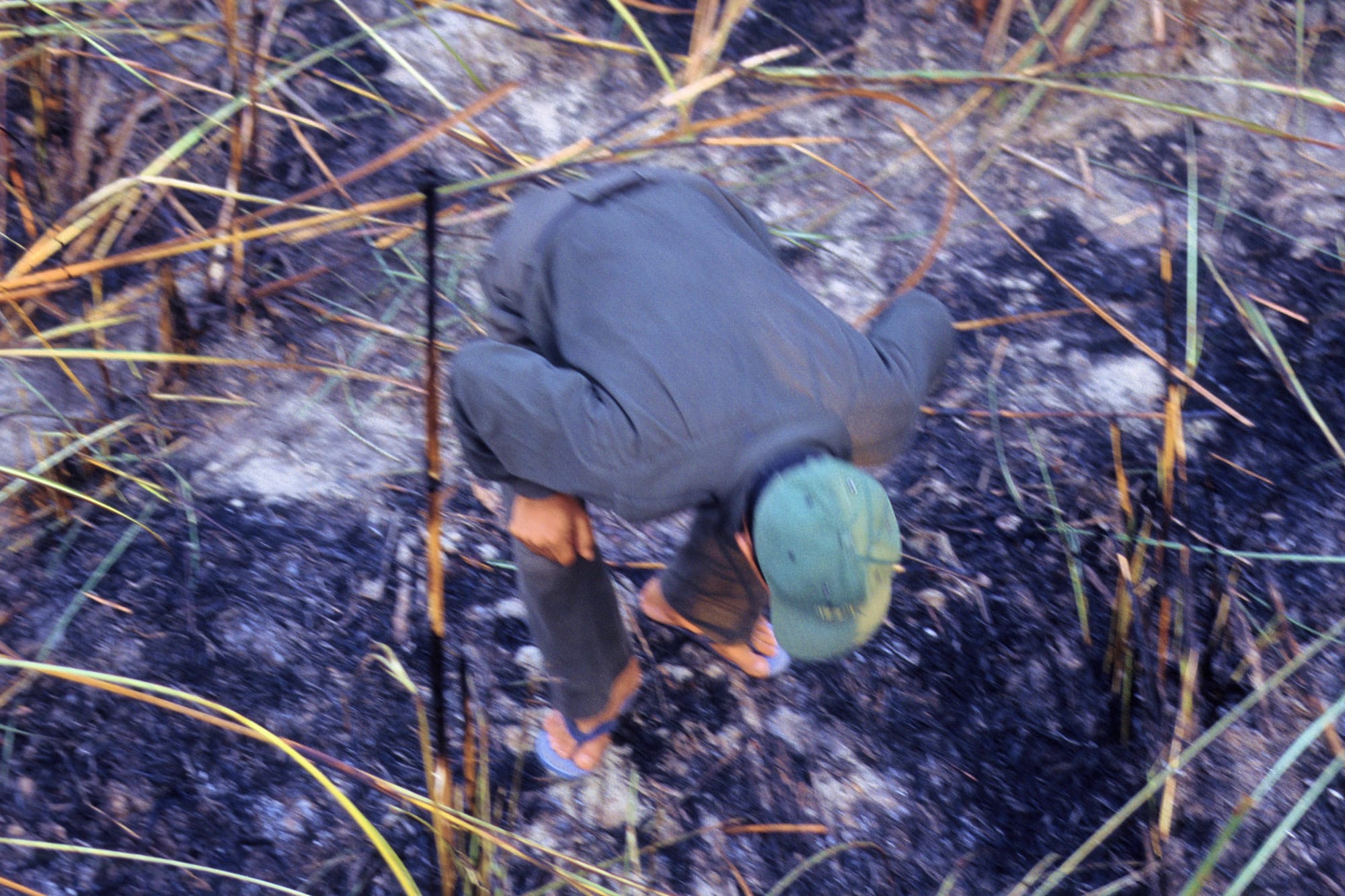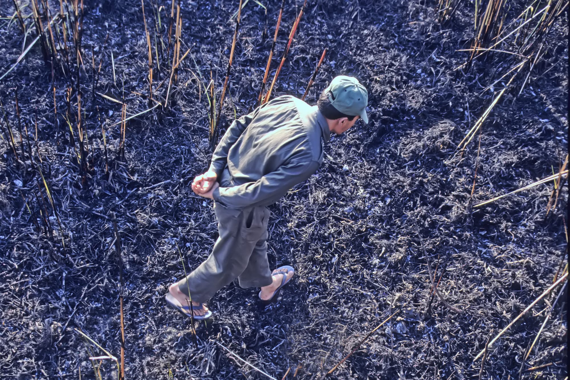The next morning, we went on an early safari and we got Gaj and the same two guides. Only one other elephant went out that morning, a British couple whose driver followed ours a good distance back most of the time. We drove up the valley into the rising sun, and just before 7:00am we reached the place where the fires had been burning. The ground was black, and the tree stumps were still smoldering, each sending up a plume of grey smoke. They spotted some tiger tracks, but these ones were very subtle and I couldn't see them.