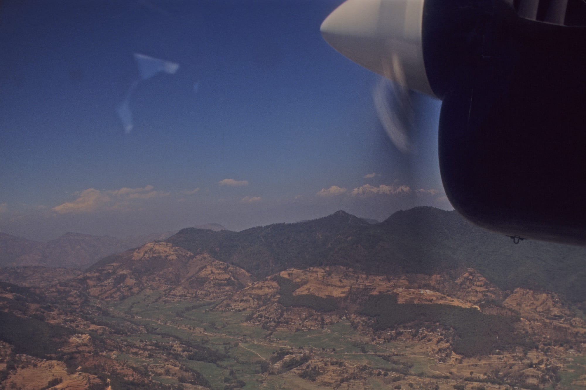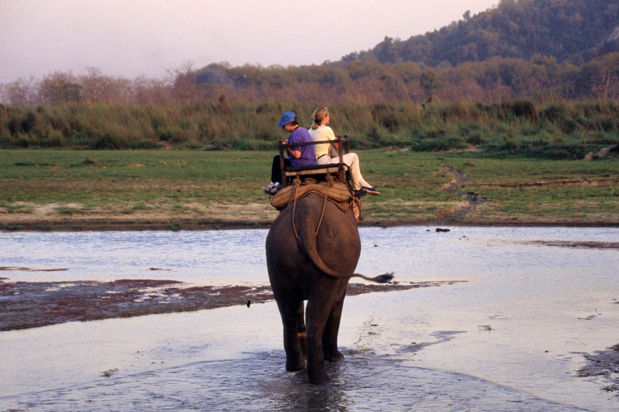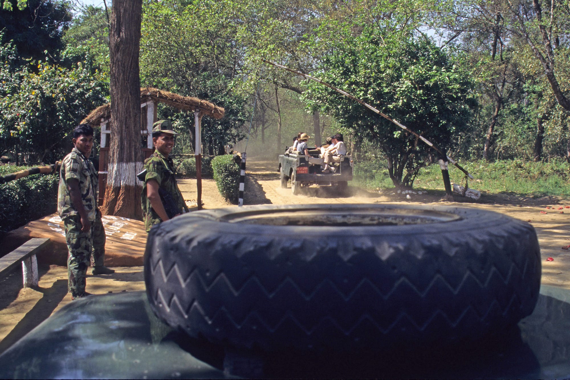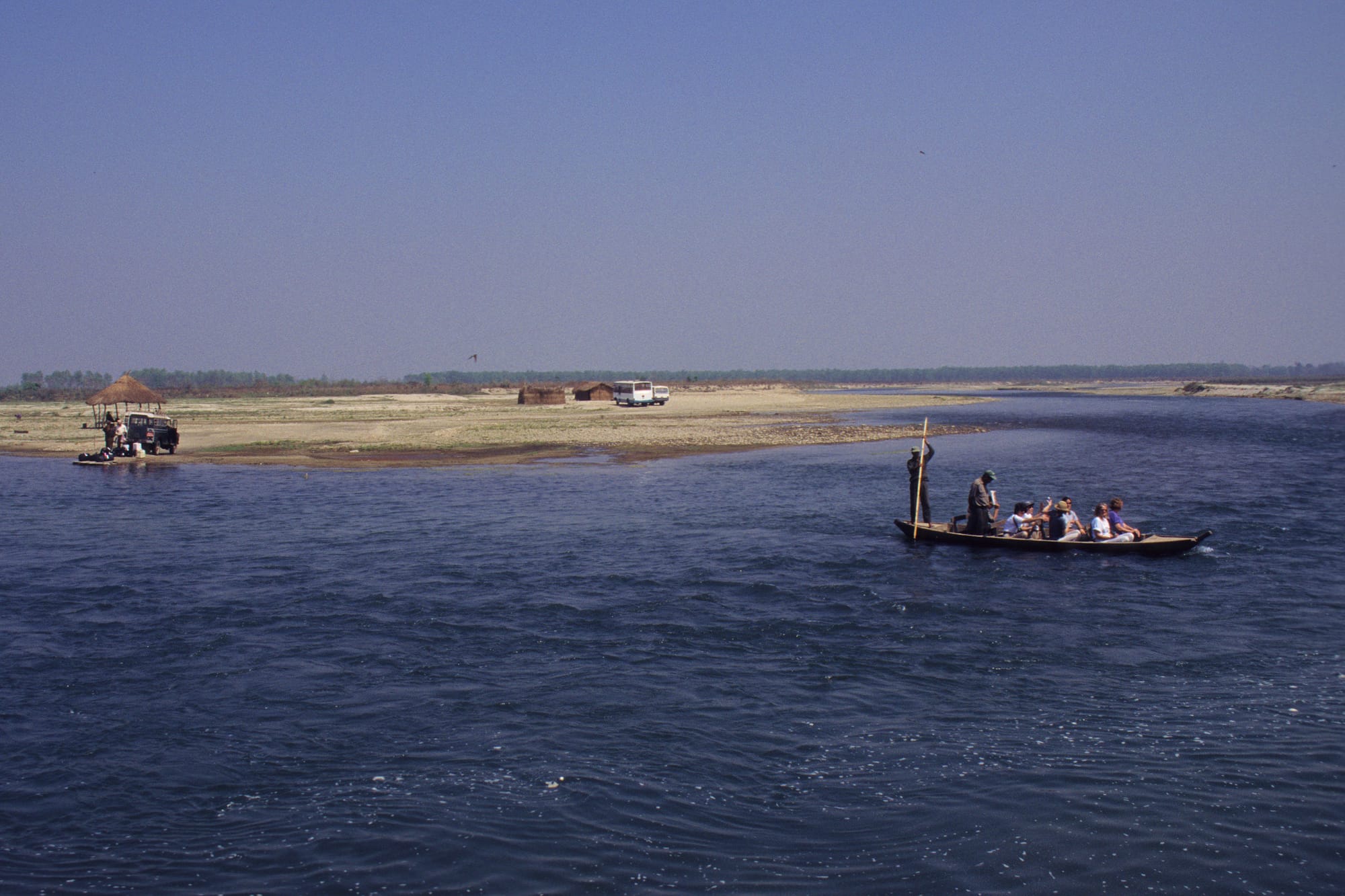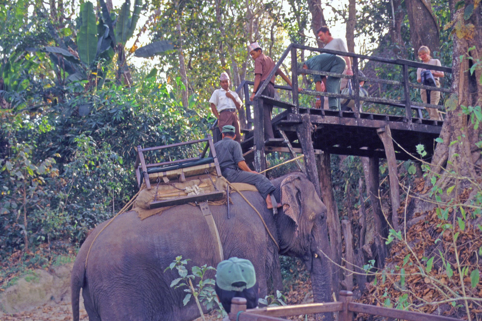 It's only about 50 miles from Kathmandu to Tiger Tops Tent Lodge, but it took several hours to get there. First we flew in a Twin Otter prop plane across the Kathmandu Valley and down into the low-lying area near the Terai River. Then we rode a jeep through the jungle and into the national park. At the Terai River, guides were waiting to ferry us across in flat-bottom canoes, then we had another jeep ride, and then finally a 1-mile walk through the jungle to the tent camp on a ridge overlooking the jungle. Porters delivered our luggage to the tents shortly after we arrived.