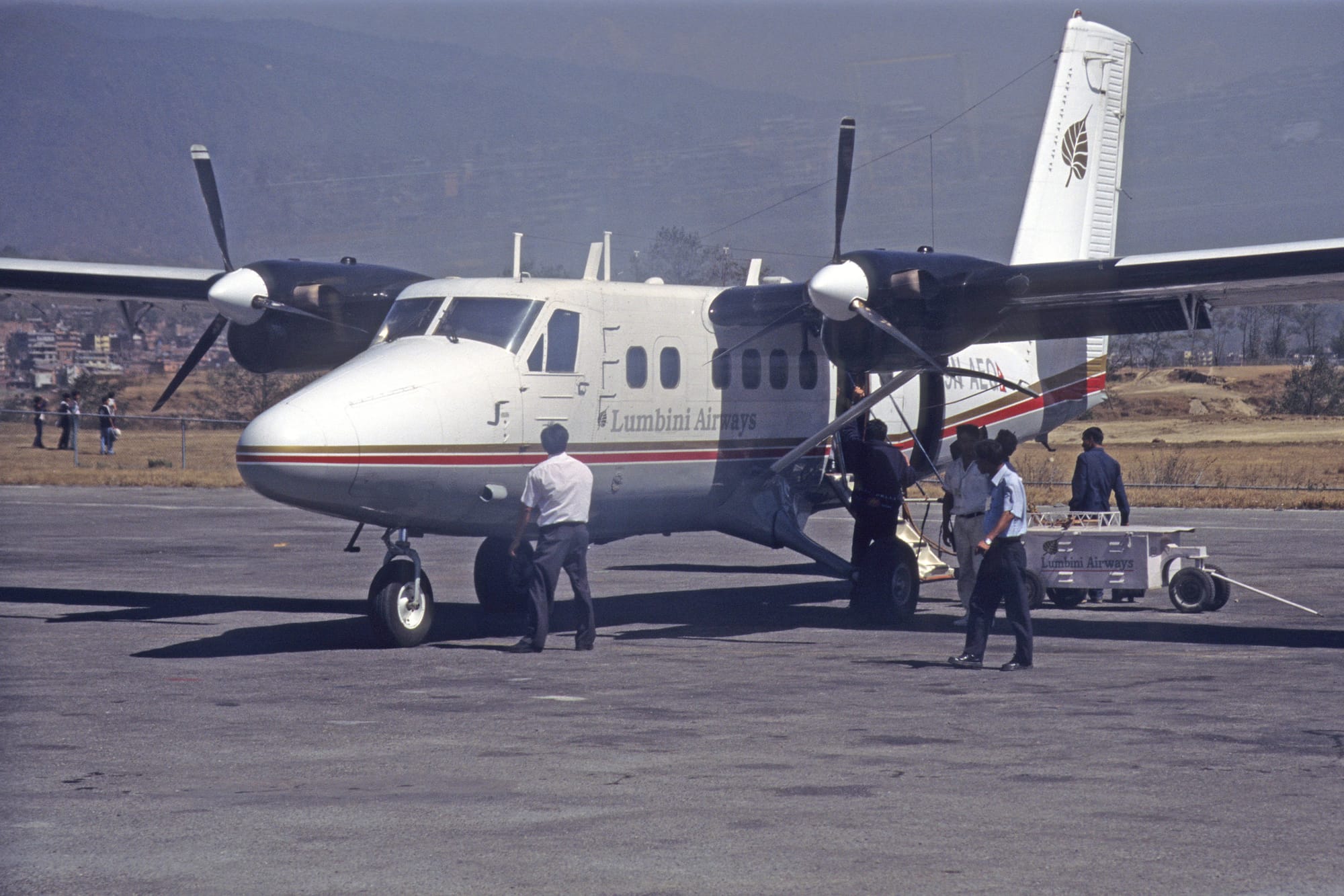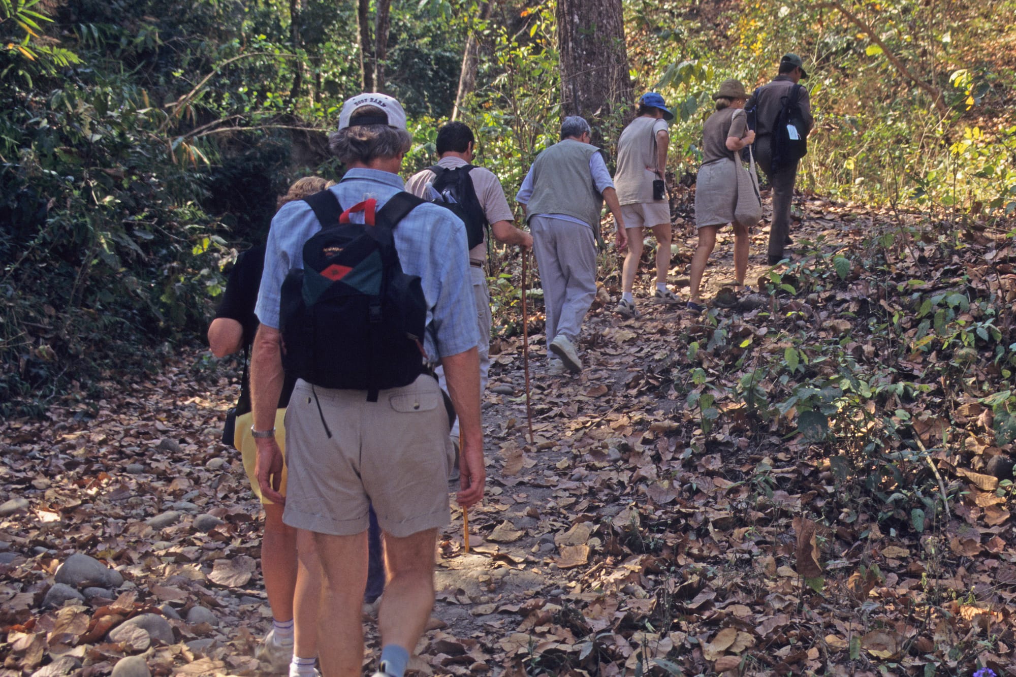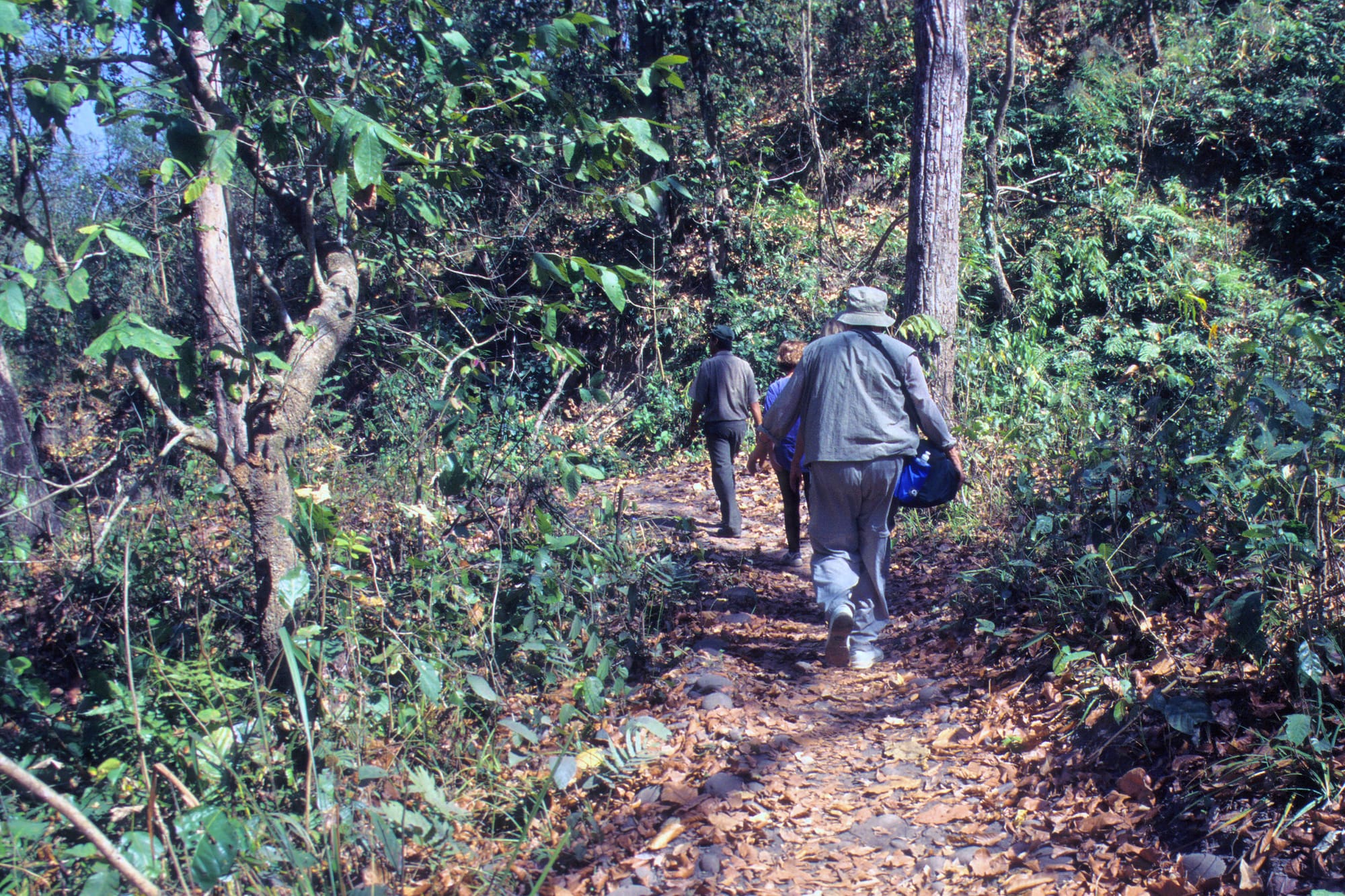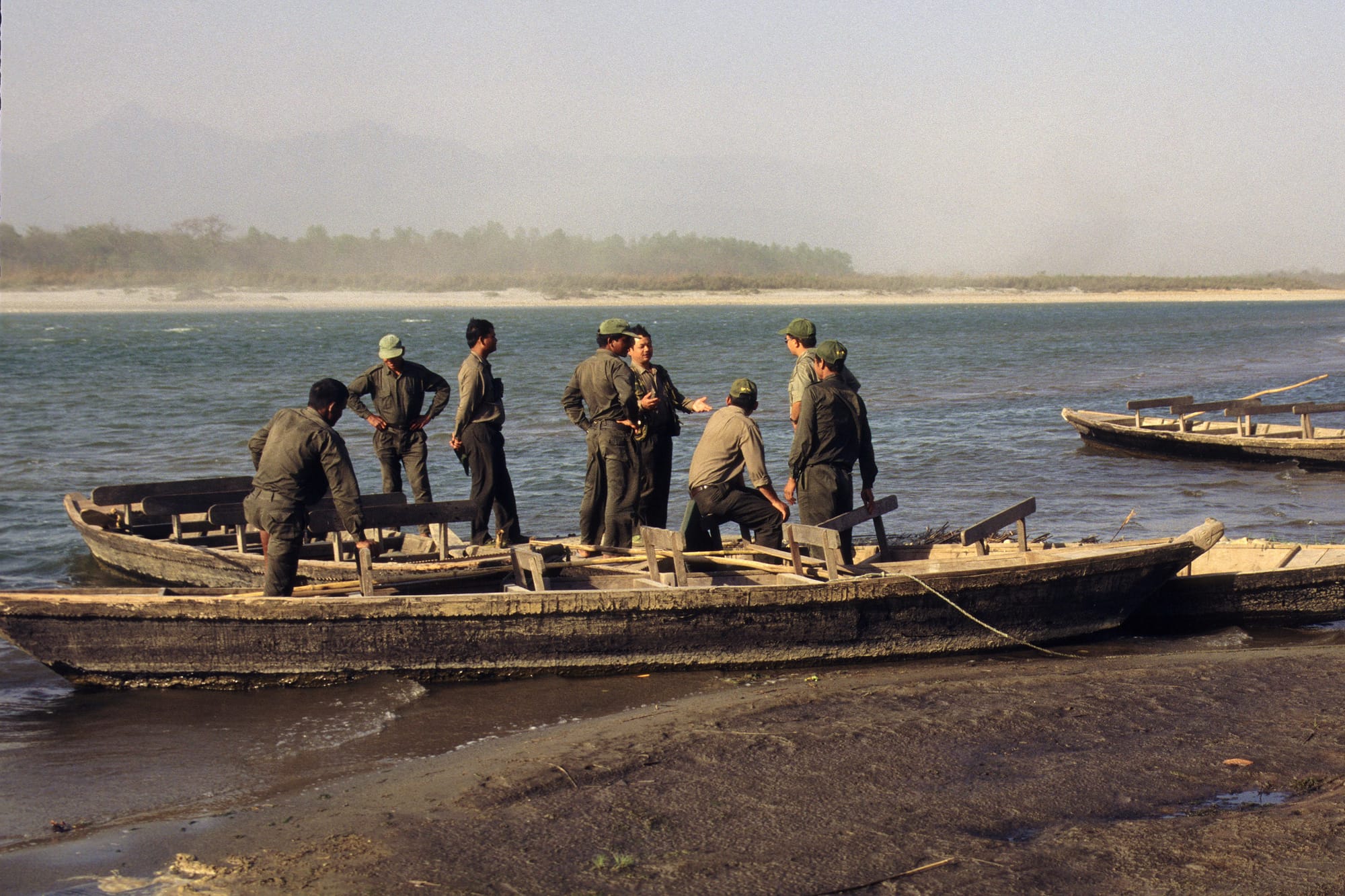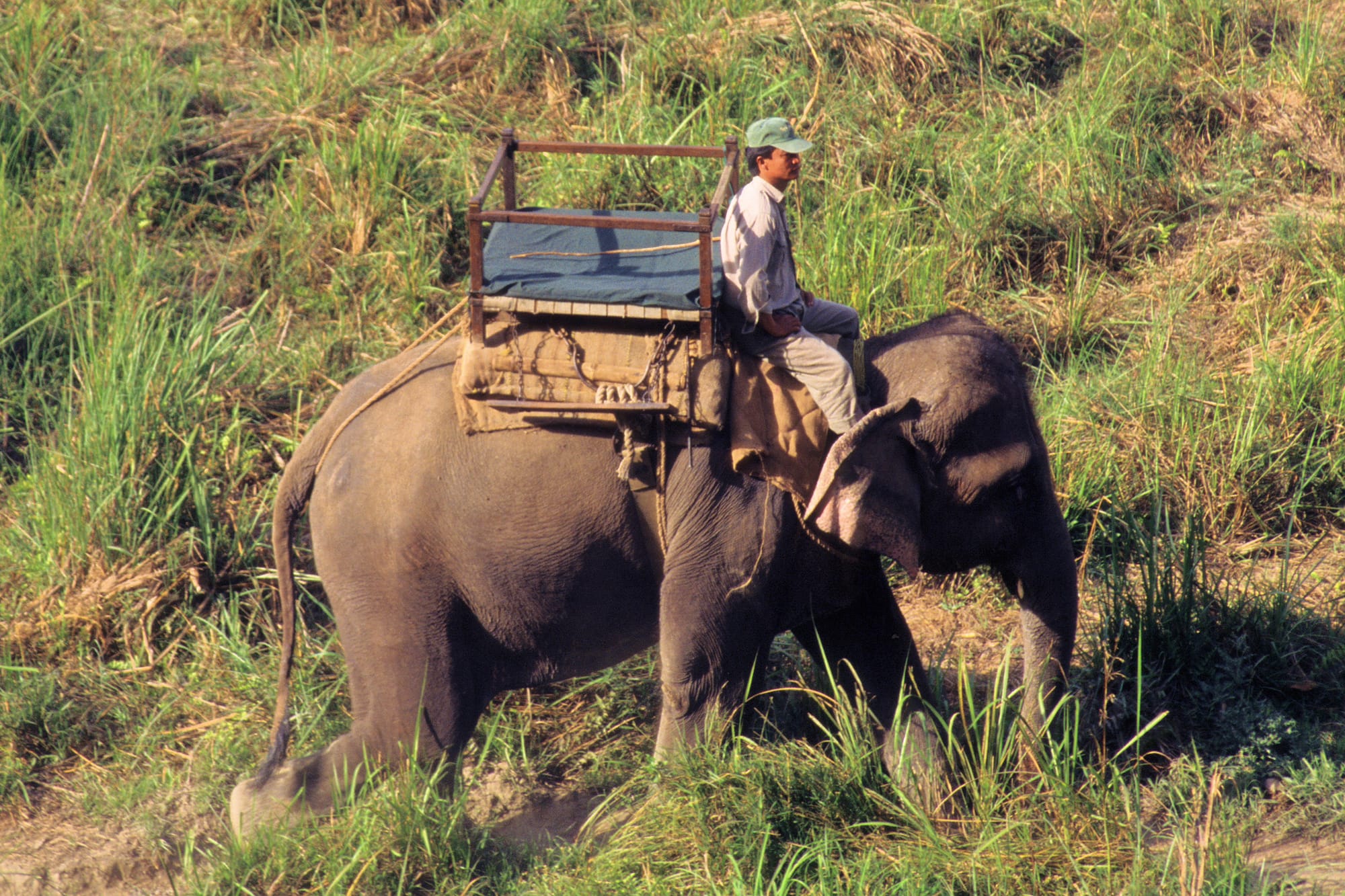 It's only about 50 miles from Kathmandu to Tiger Tops Tent Lodge, but it took several hours to get there. First we flew in a Twin Otter prop plane across the Kathmandu Valley and down into the low-lying area near the Terai River. Then we rode a jeep through the jungle and into the national park. At the Terai River, guides were waiting to ferry us across in flat-bottom canoes, then we had another jeep ride, and then finally a 1-mile walk through the jungle to the tent camp on a ridge overlooking the jungle. Porters delivered our luggage to the tents shortly after we arrived.