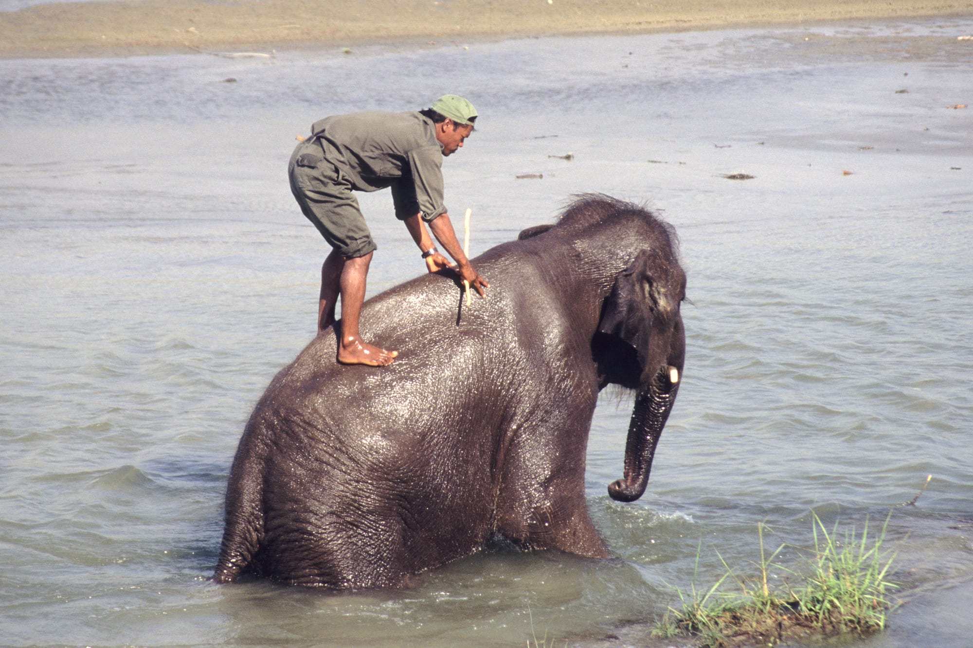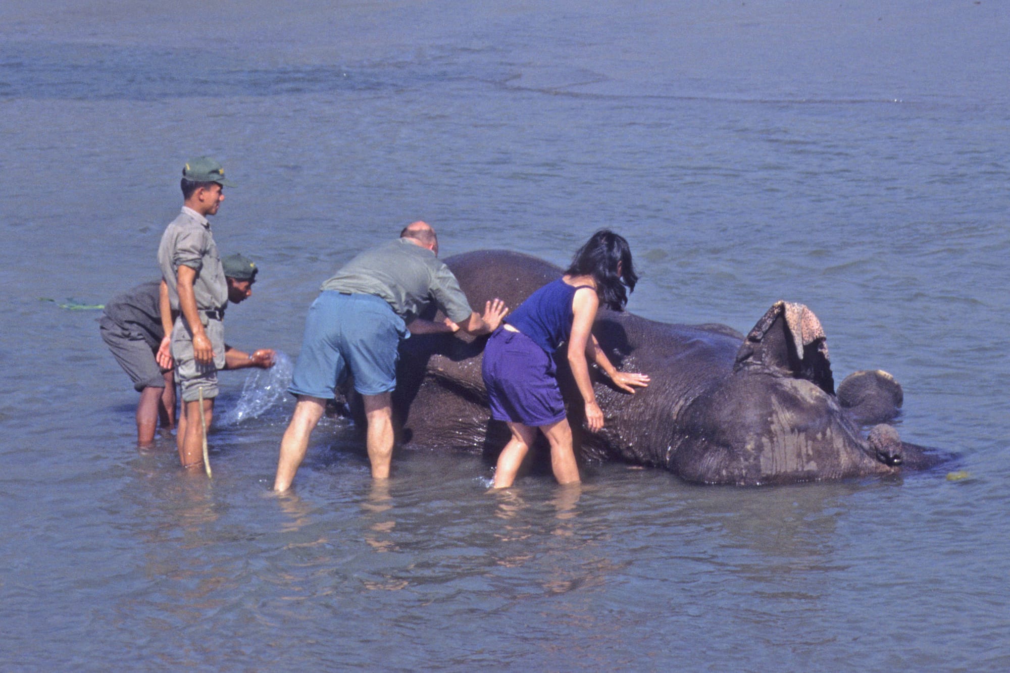We went to help wash the elephants in the afternoon, and that was fun. I waded into the river and splashed water on them while they lay on their sides in a foot or two of water, and then we would rub their hides and so on. There was a baby elephant who was a real joker, playing in the water with us, and that was fun.