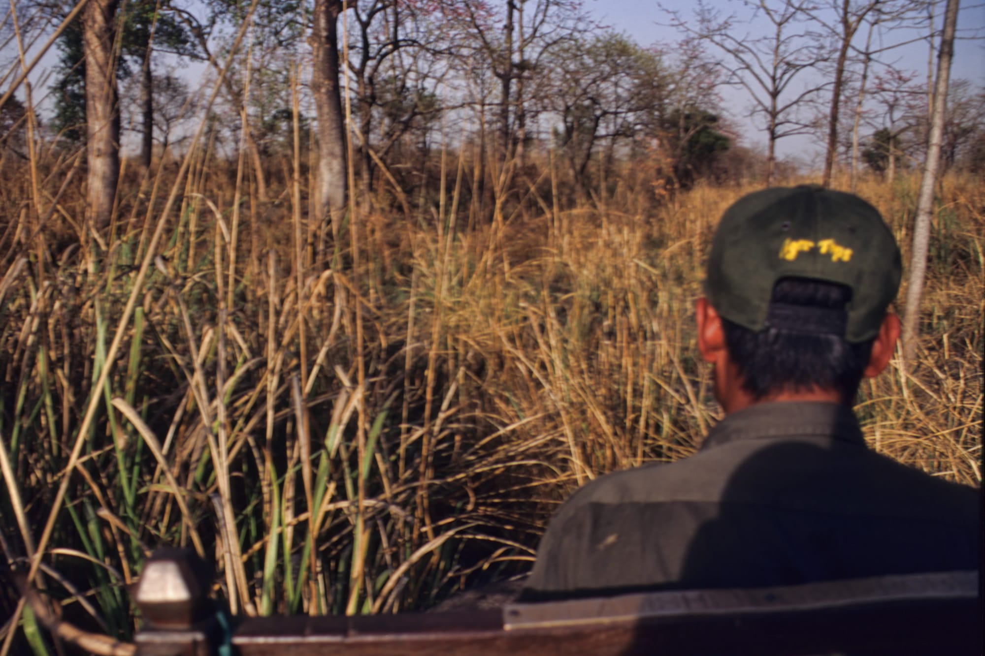 We continued to track in various directions, and our driver whistled to the other elephant's driver to have them make a flanking move to cut off any chance of the tiger slipping away toward the river. Then, suddenly, they were both screaming TIGER, TIGER, and there he was, about 70 yards straight ahead of us. He was standing on low half-burned grass, and the sun was right behind him, so I couldn't see the color, but when he turned and bolted away there was a great silhouette of his powerful and graceful gait. He stopped, partially behind a tree, and I hesitated to snap a picture because I was near the end of a roll of film and I thought we'd get another chance when he moved away from the tree, but he ran straight away behind the tree into 10-foot tall elephant grass and disappeared.