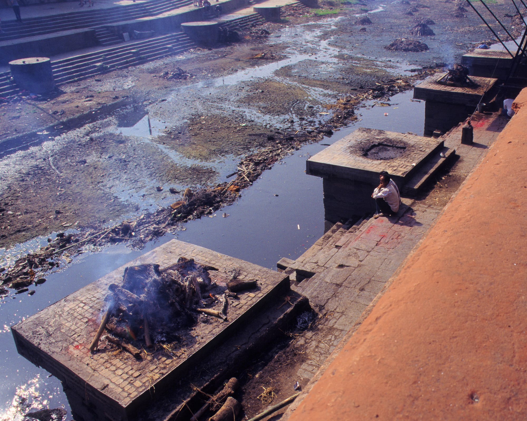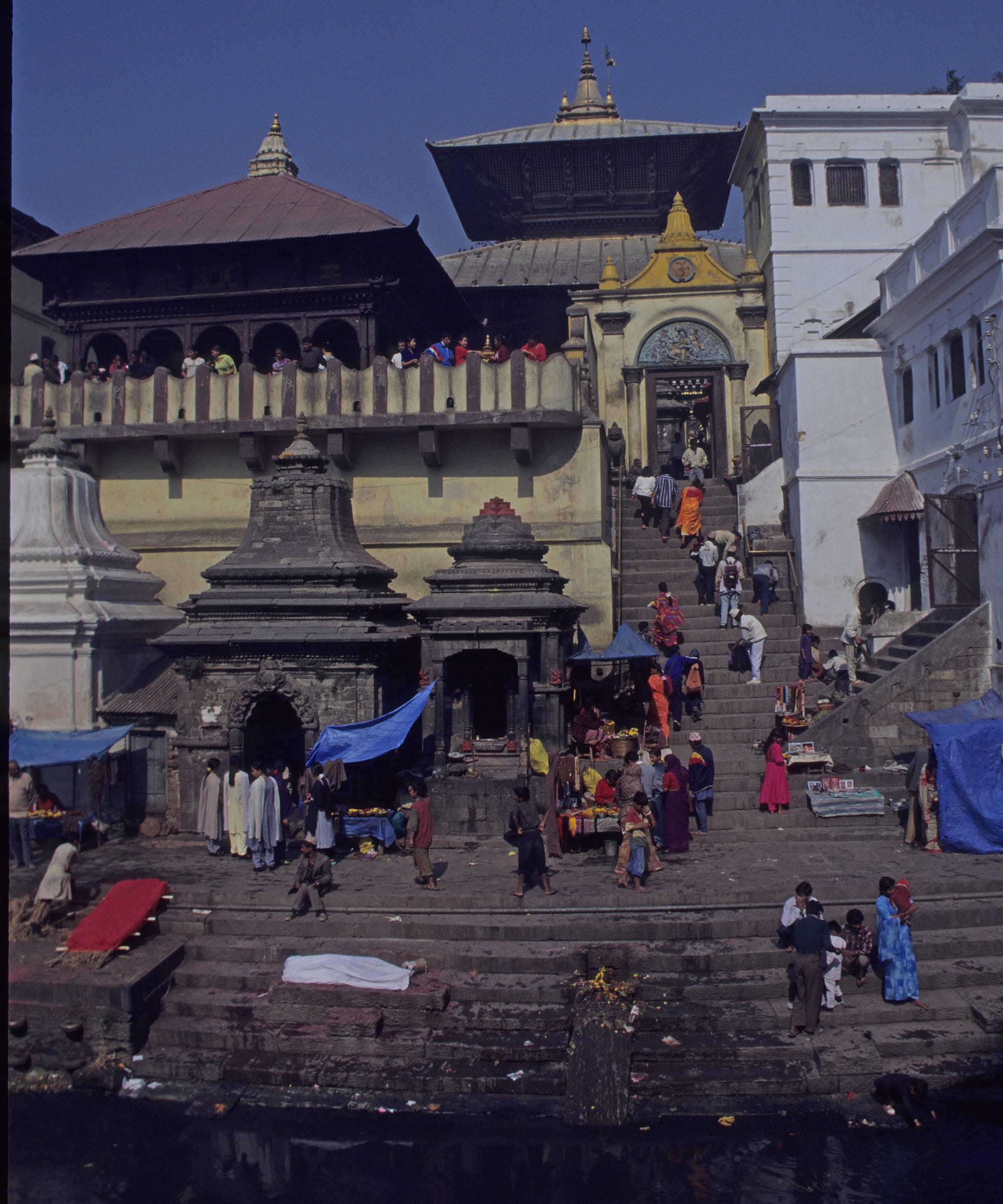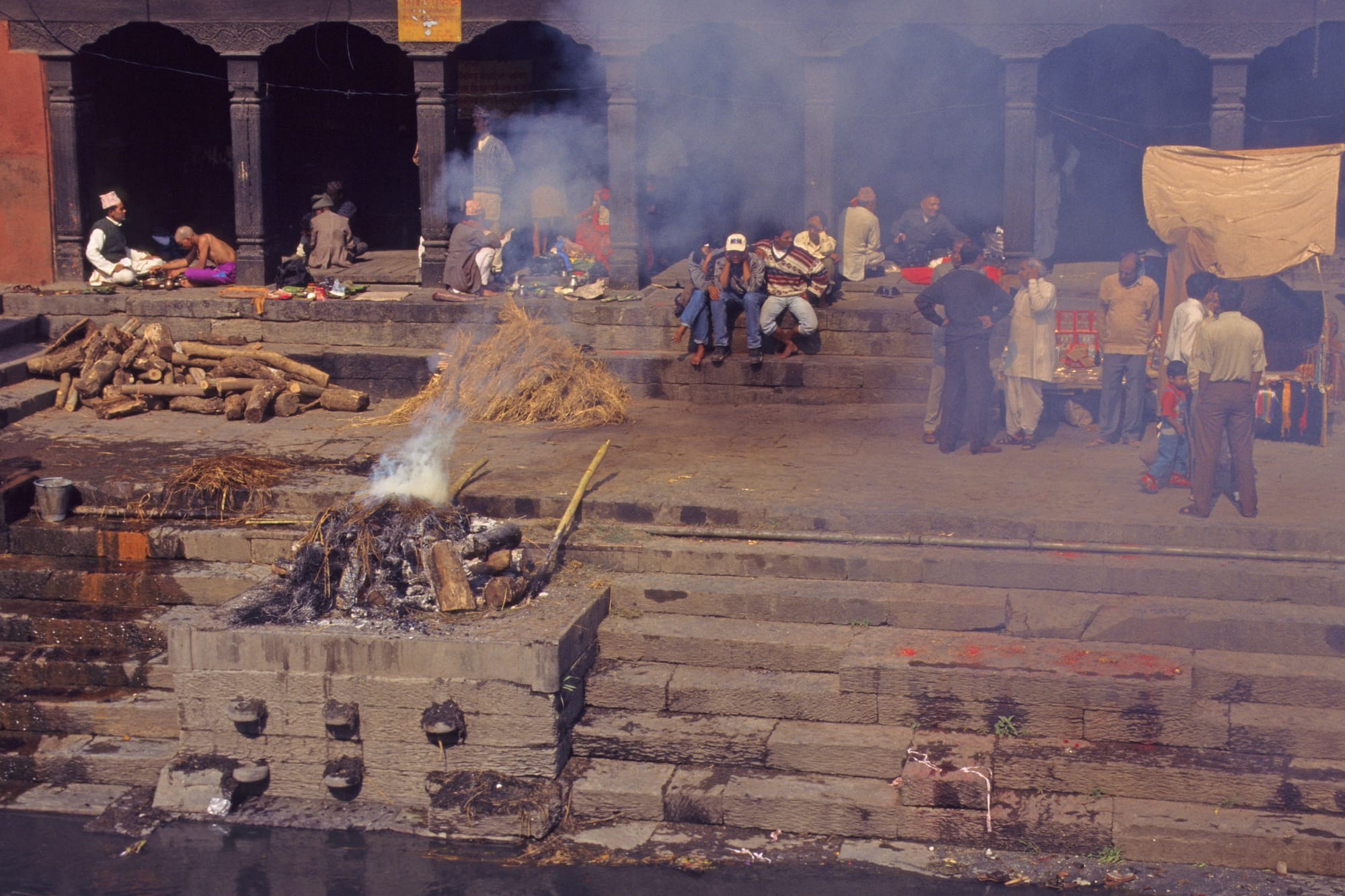 Cremations in progress at Pashupatinath along the banks of the Bagmati River. The poorest people can do cremations at the spot on the left, and it costs money to use the nicer locations further upstream on the right.