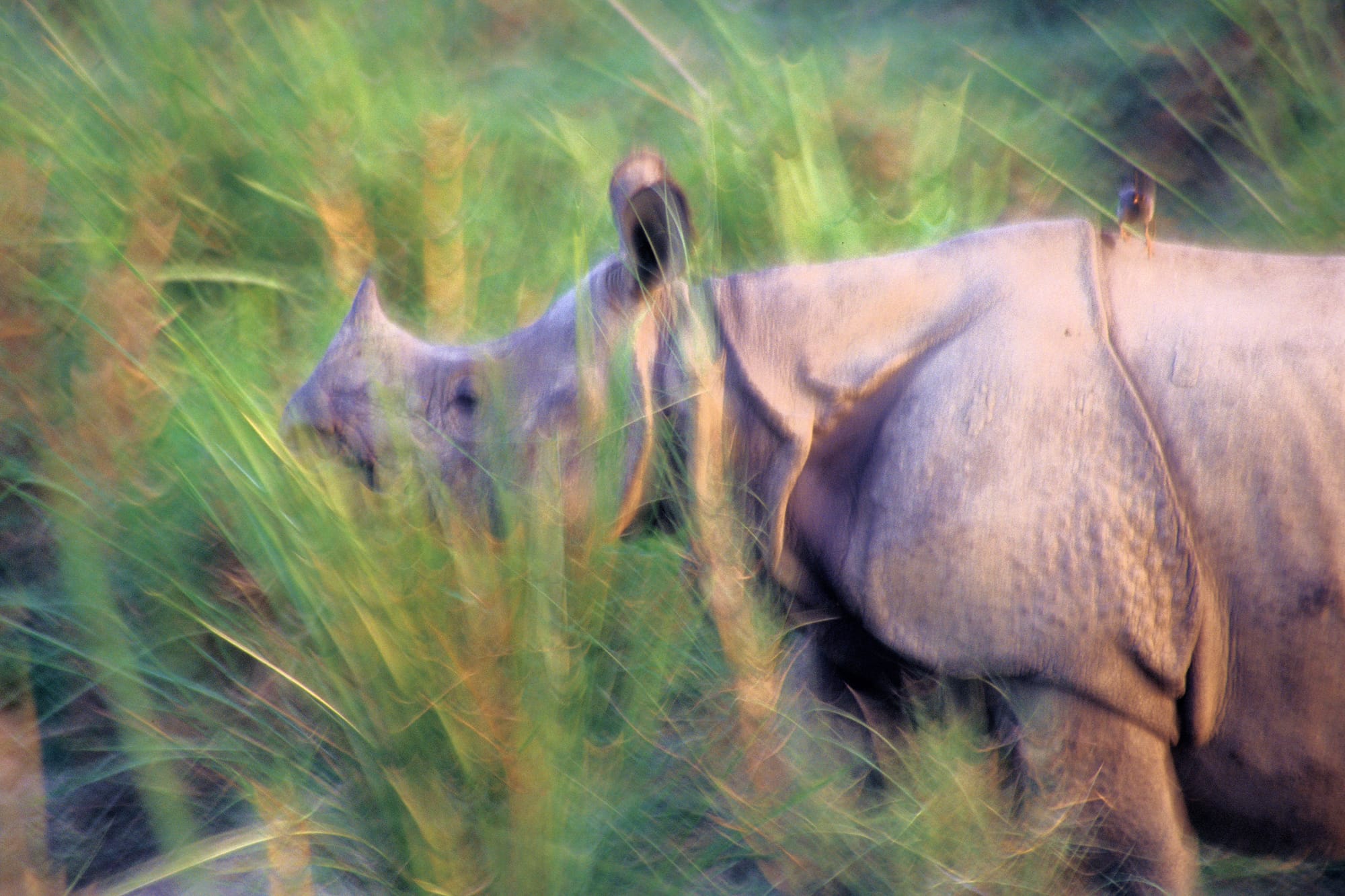 The guy on the back of the elephant jumped off, crouched down to analyze the tracks, then pointed in one direction. The driver leaned down, looked at the tracks, and pointed in another direction. They debated, we changed direction many times in the next half hour, them speaking quickly in Nepali to each other the whole time. I started to think this was a show for our benefit, to try to impress us or something. Then the birds nearby made a new type of call I hadn't heard before, and both guides got very excited, whispering "he is here, tiger here, tiger here."