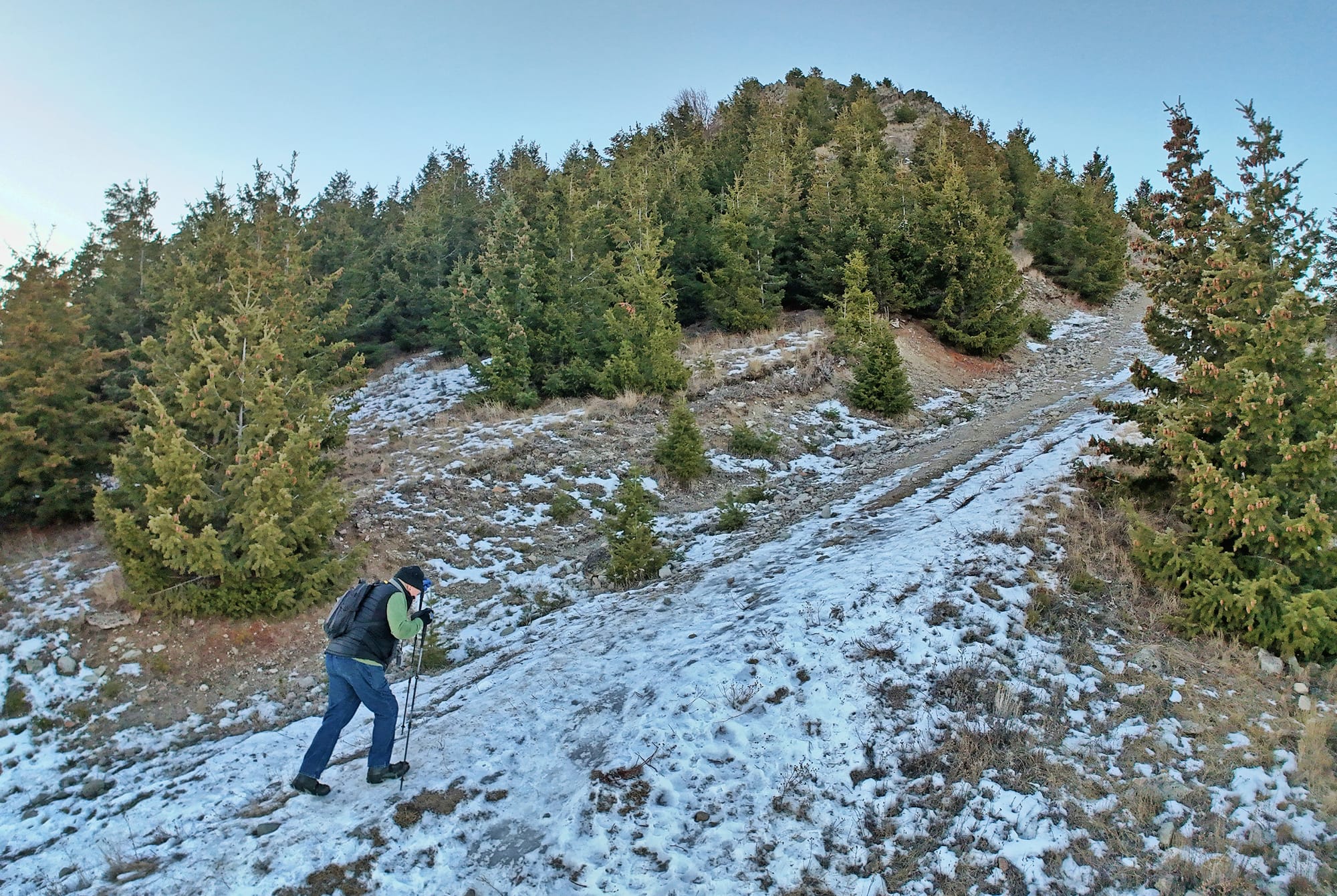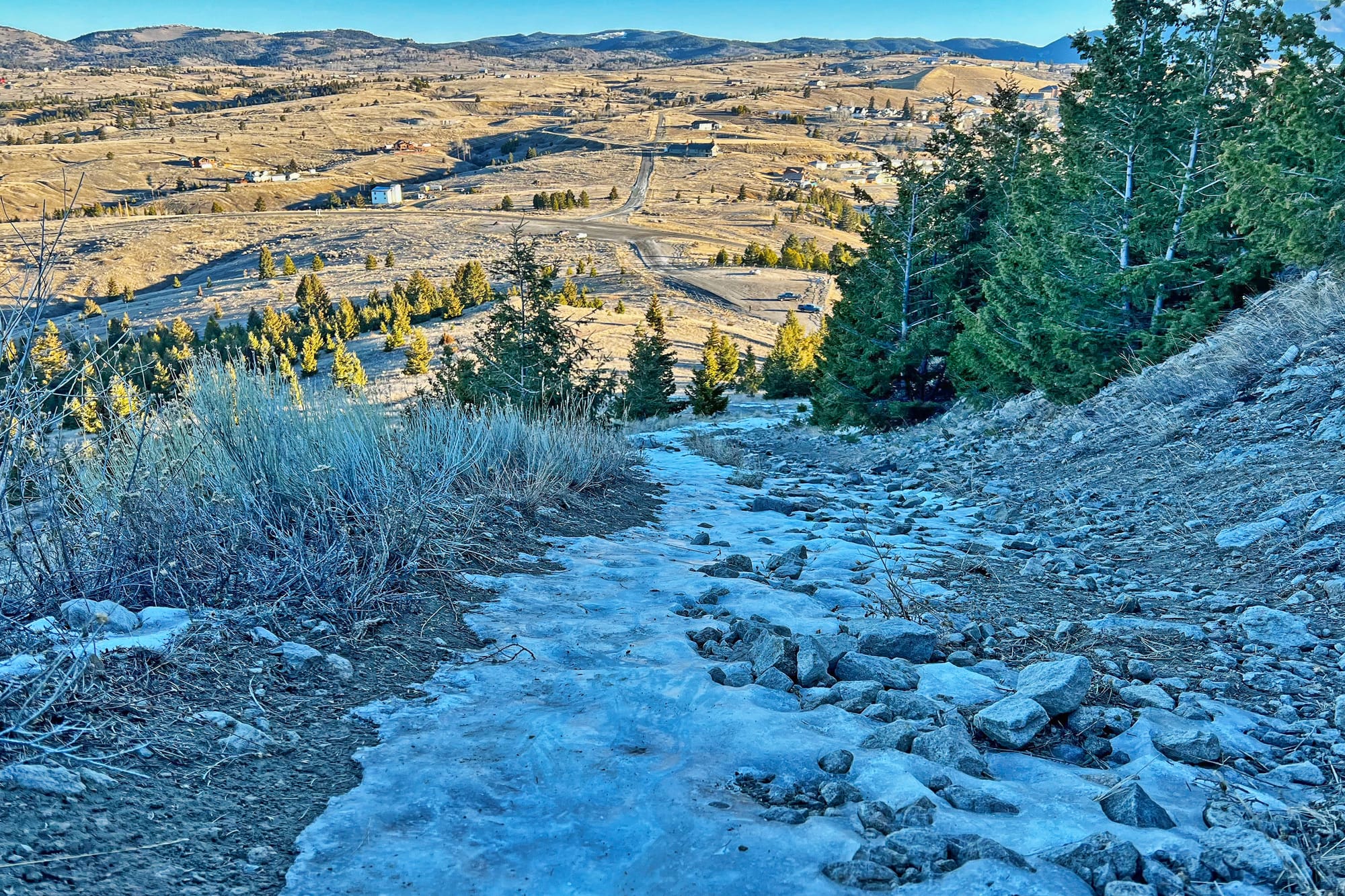 The trail is on the north side of the hill where it never gets direct sunlight, so there's currently lots of slick ice to navigate.