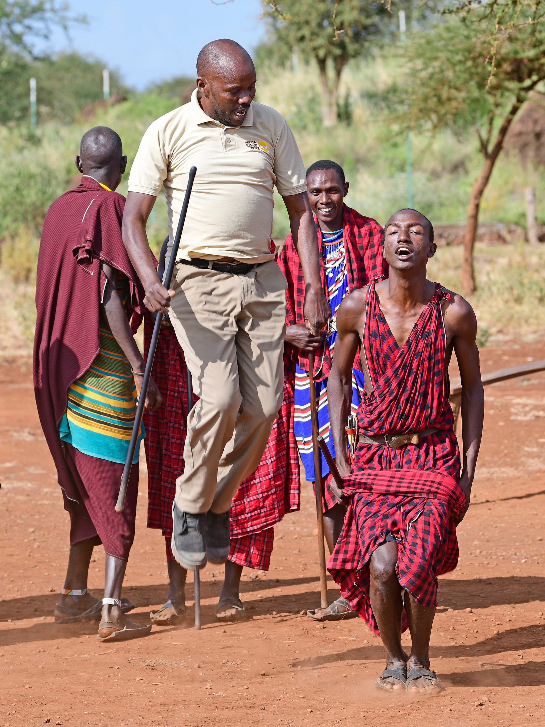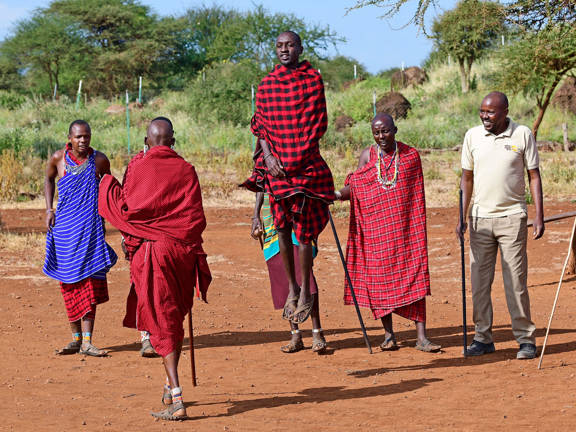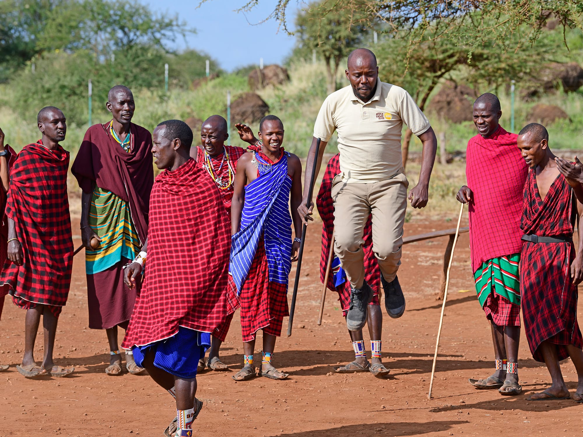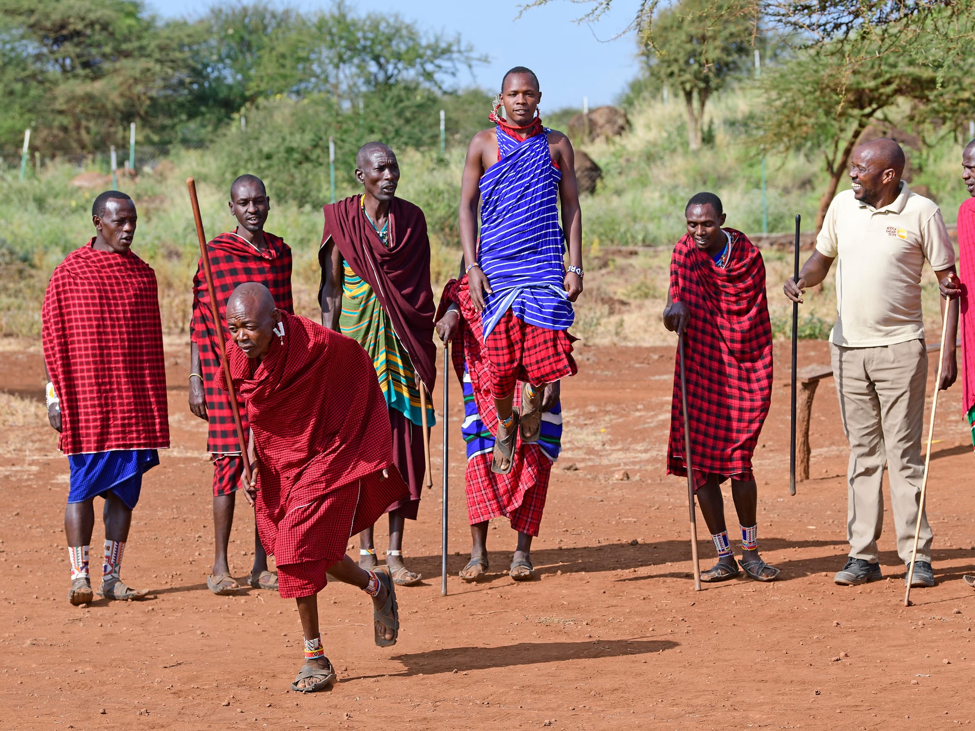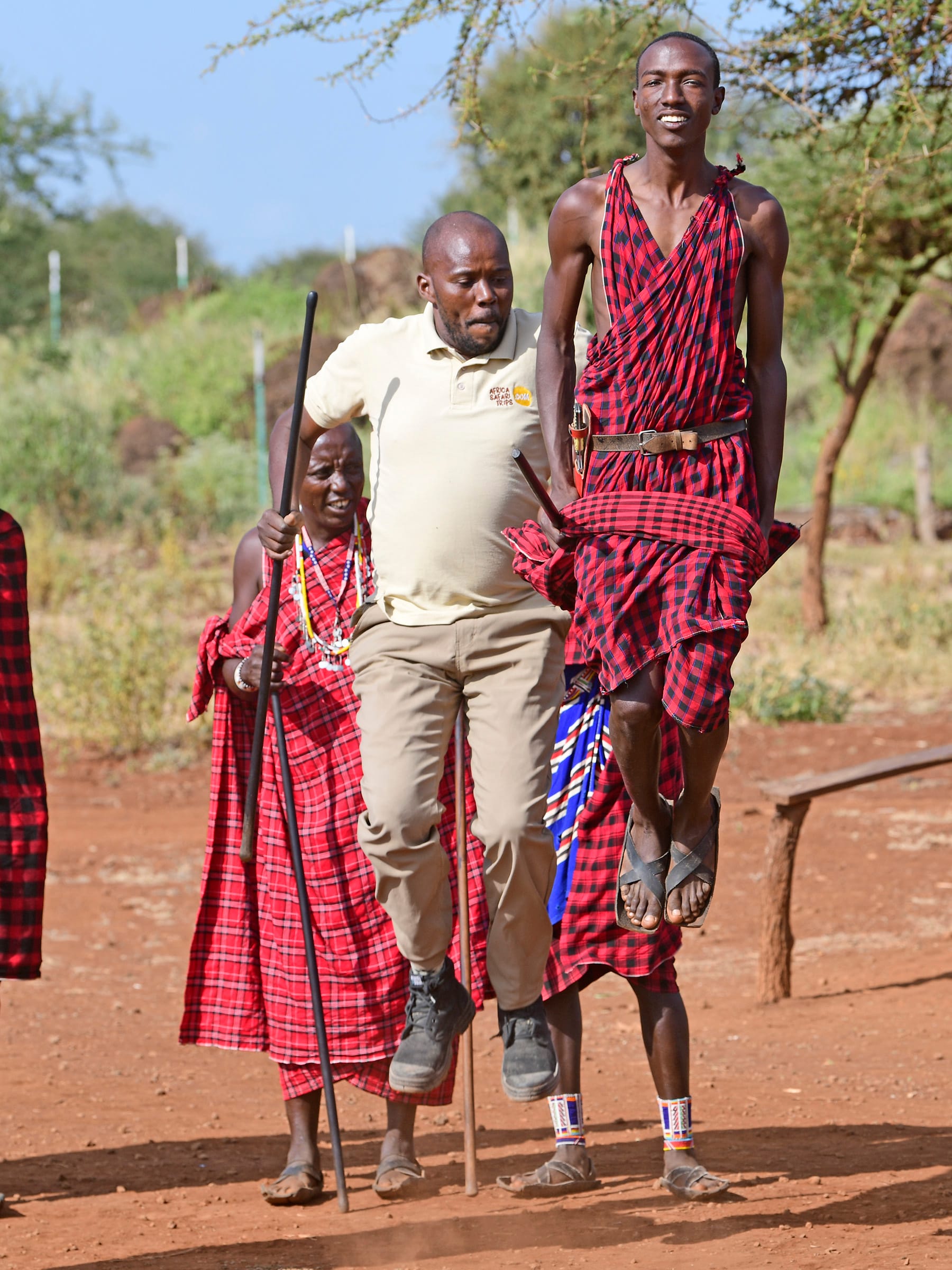 The traditional Masaai greeting for visitors involves singing and dancing. The men do a high-jumping contest when they dance.