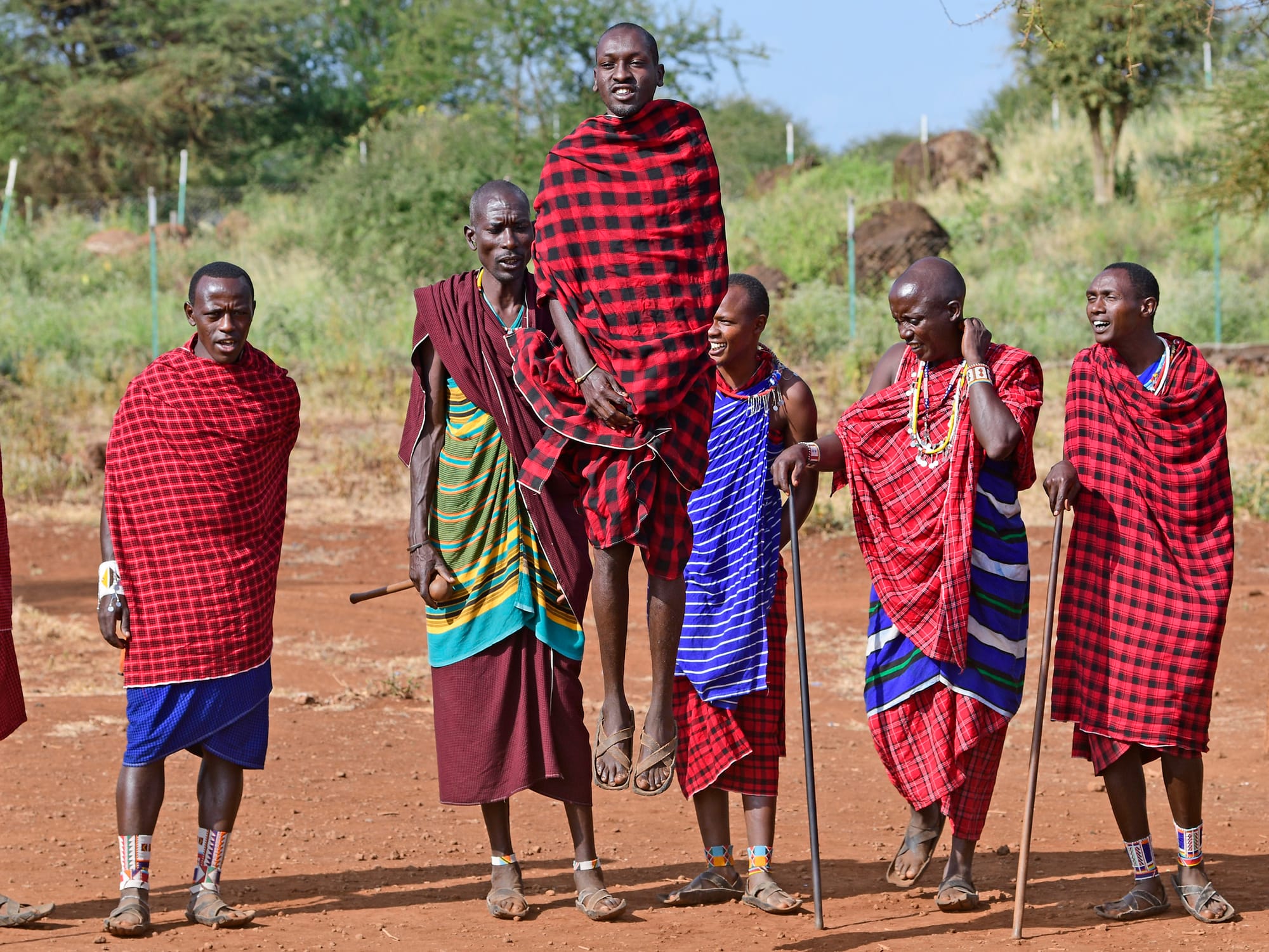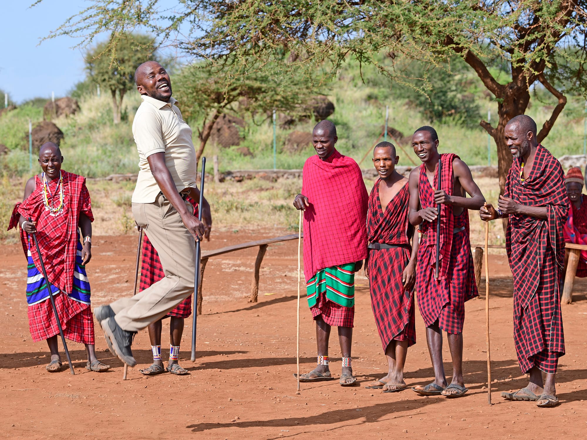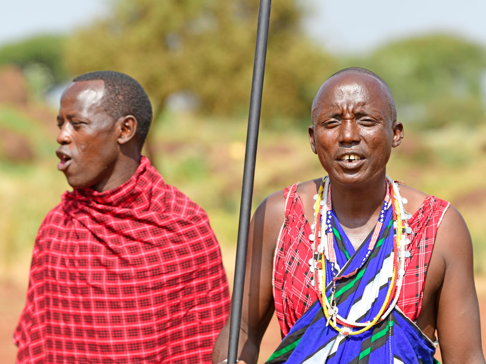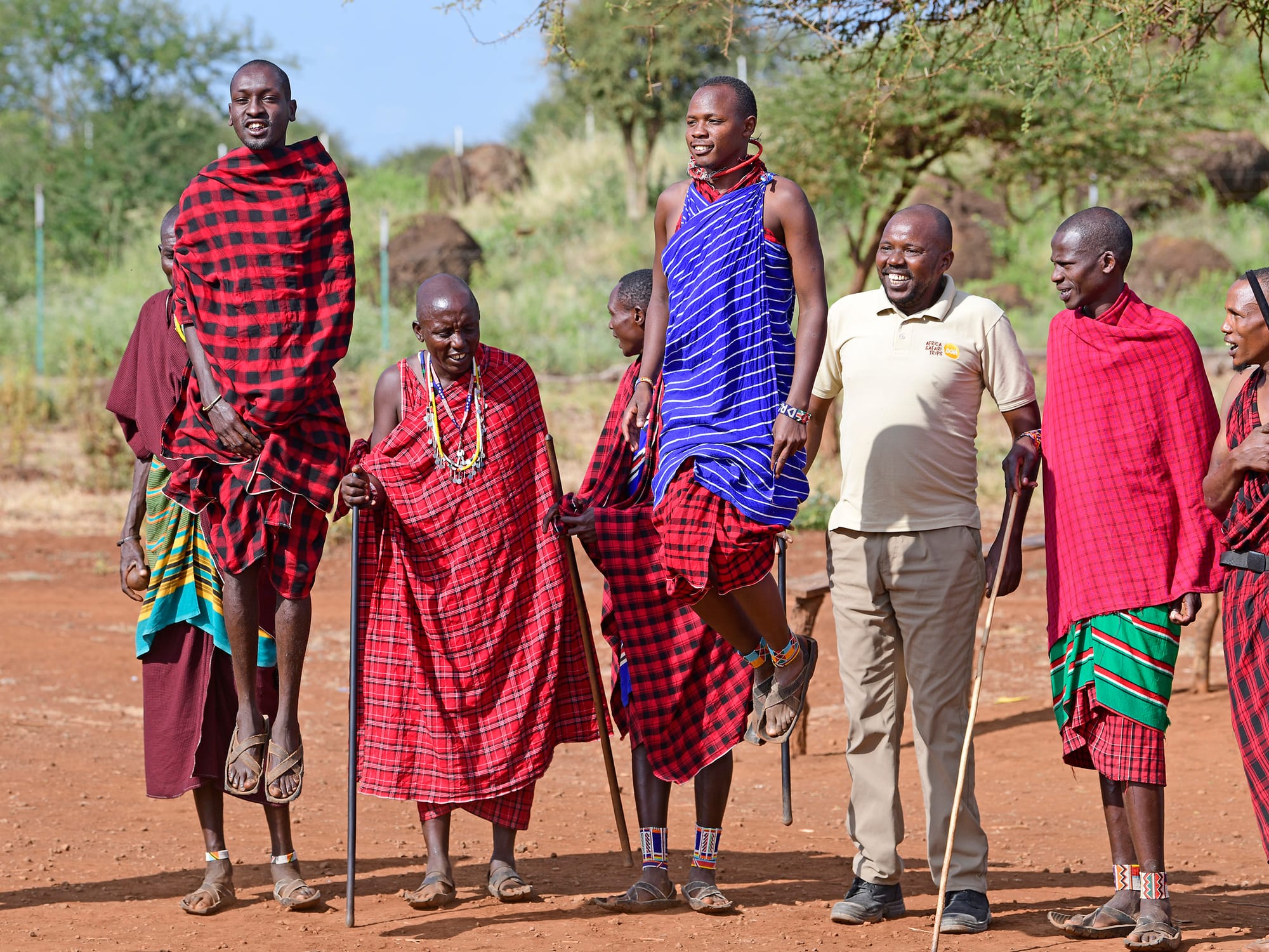 The traditional Masaai greeting for visitors involves singing and dancing. The men do a high-jumping contest when they dance.