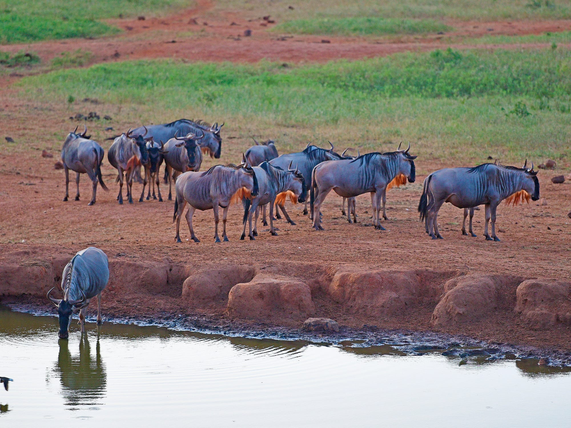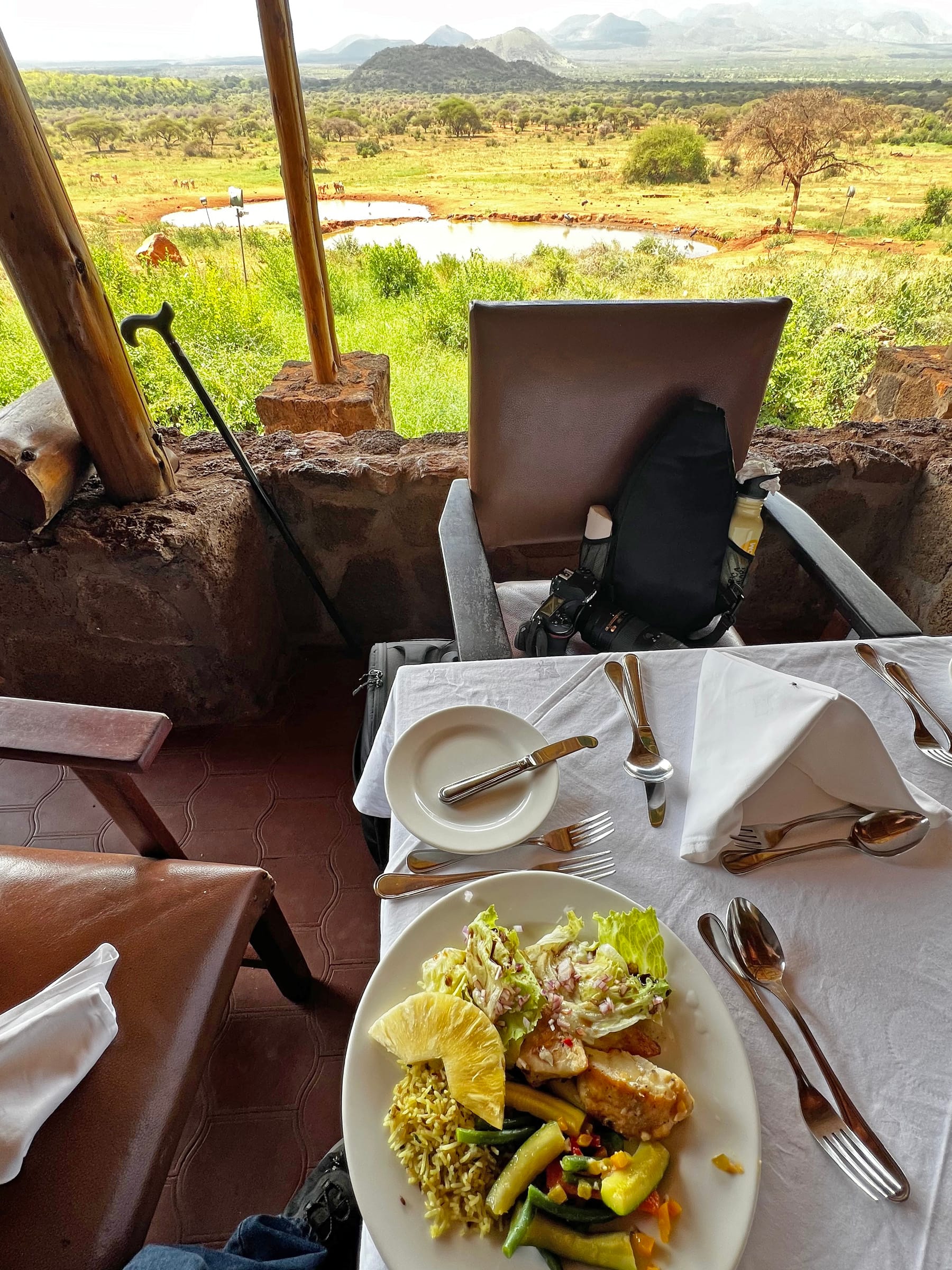 Checking in to Kilaguni Serena Lodge, our final destination for this trip. There is a watering hole in front of the restaurant and bar area, and animals come to it all day and night.