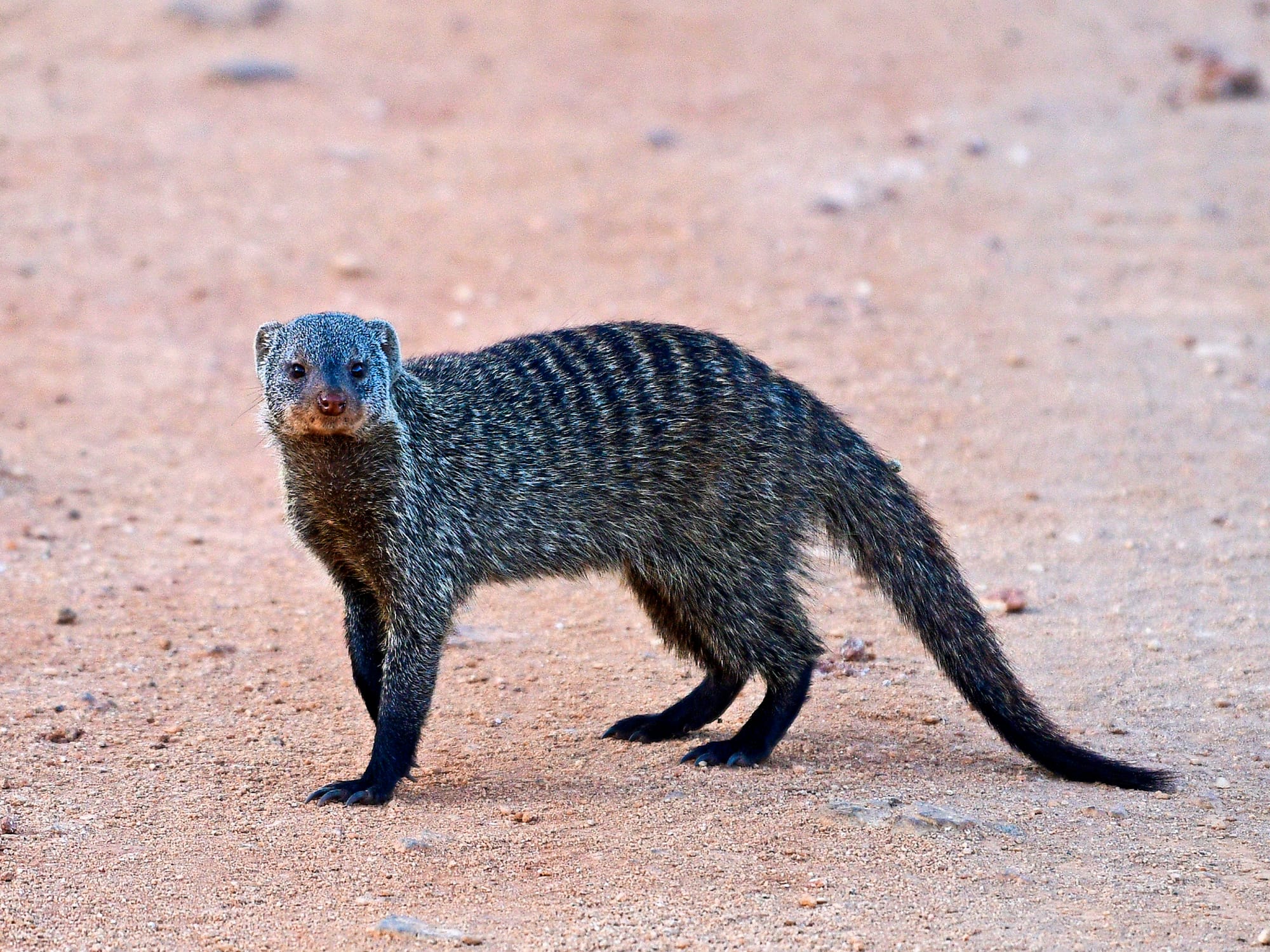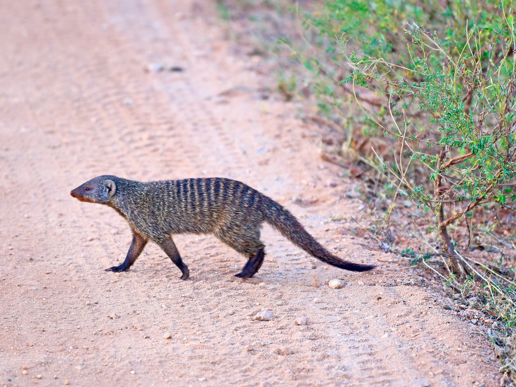 Mongoose crossing the road. There are many mongoose at Tsavo West, because there are many snakes for them to eat.