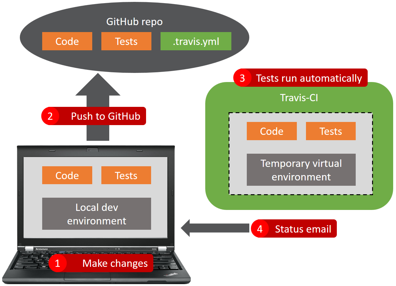 Here’s an overview of a typical simple workflow that uses Travis-CI for test automation: