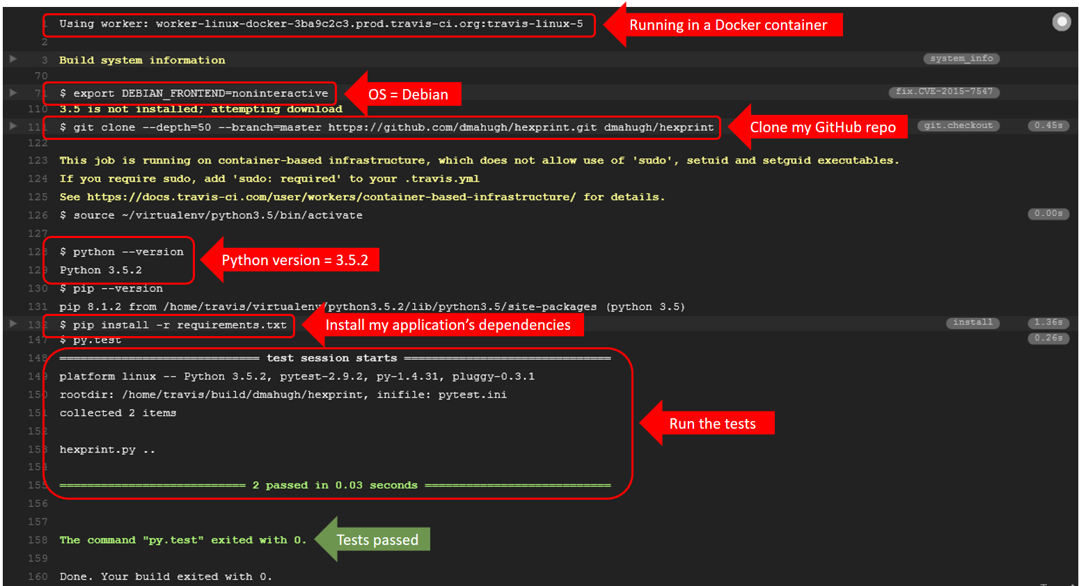 You can see that the same tests are run in both cases. I ran them locally under Windows 10, and Travis-CI ran them under Debian Linux in a Docker container, but the tests passed in both cases. Here are the contents of my .travis.yml and requirements.txt files for this repo: