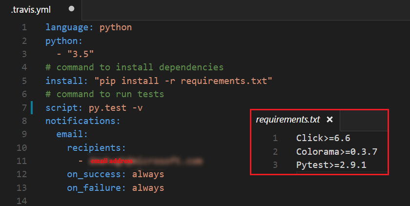 Note that I’ve only specified Python 3.5 for my tests. That works for this simple case, but one of the benefits of using Travis-CI is that you can list a variety of runtime alternatives to test your code. See the Travis-CI Python documentation for an example of how to run your tests under many different Python versions, for example.