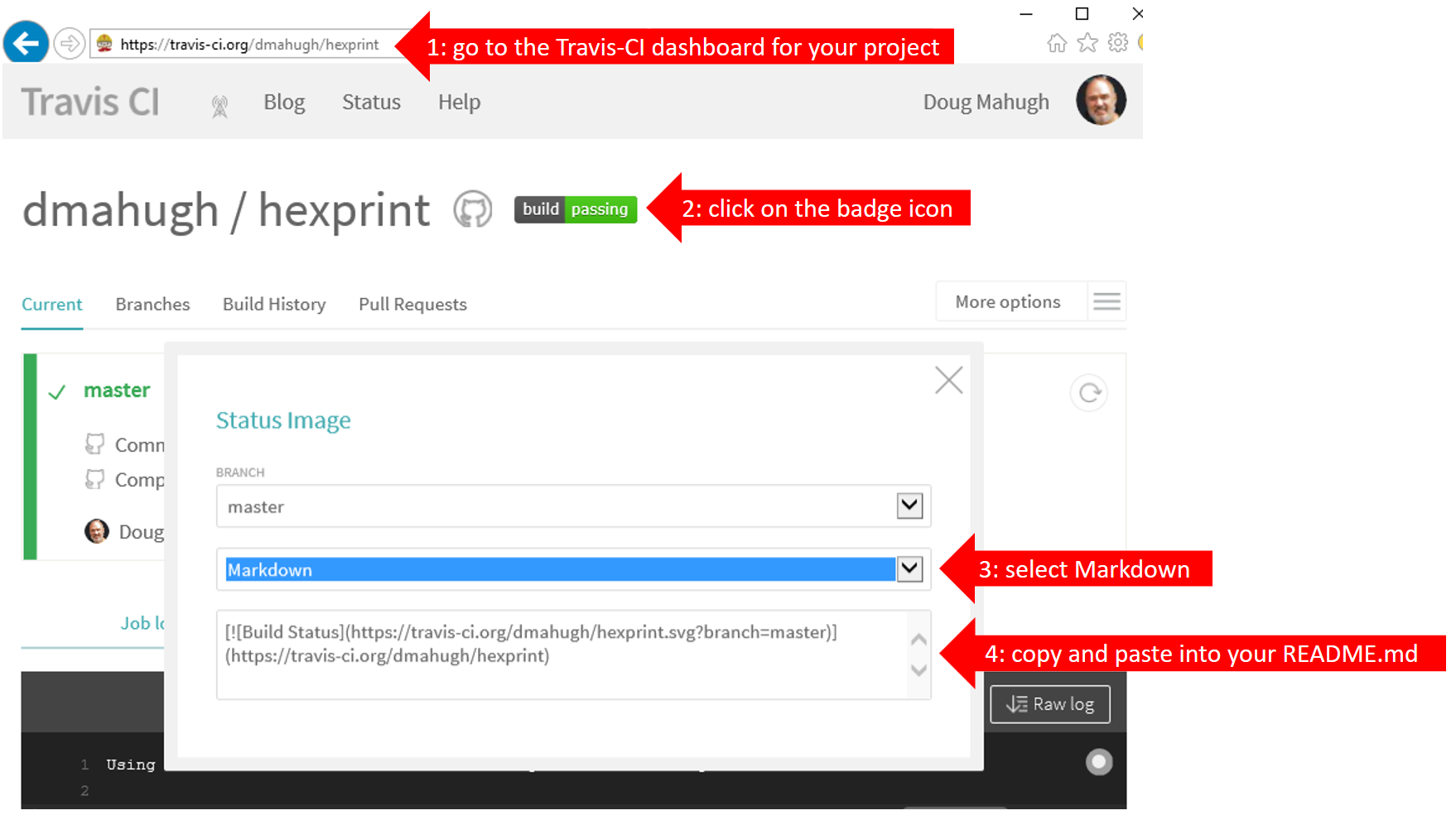 To put a badge like that on your project’s README, you need to copy some Markdown from the Travis-CI dashboard page and paste it into your README.md file. Here are the details: