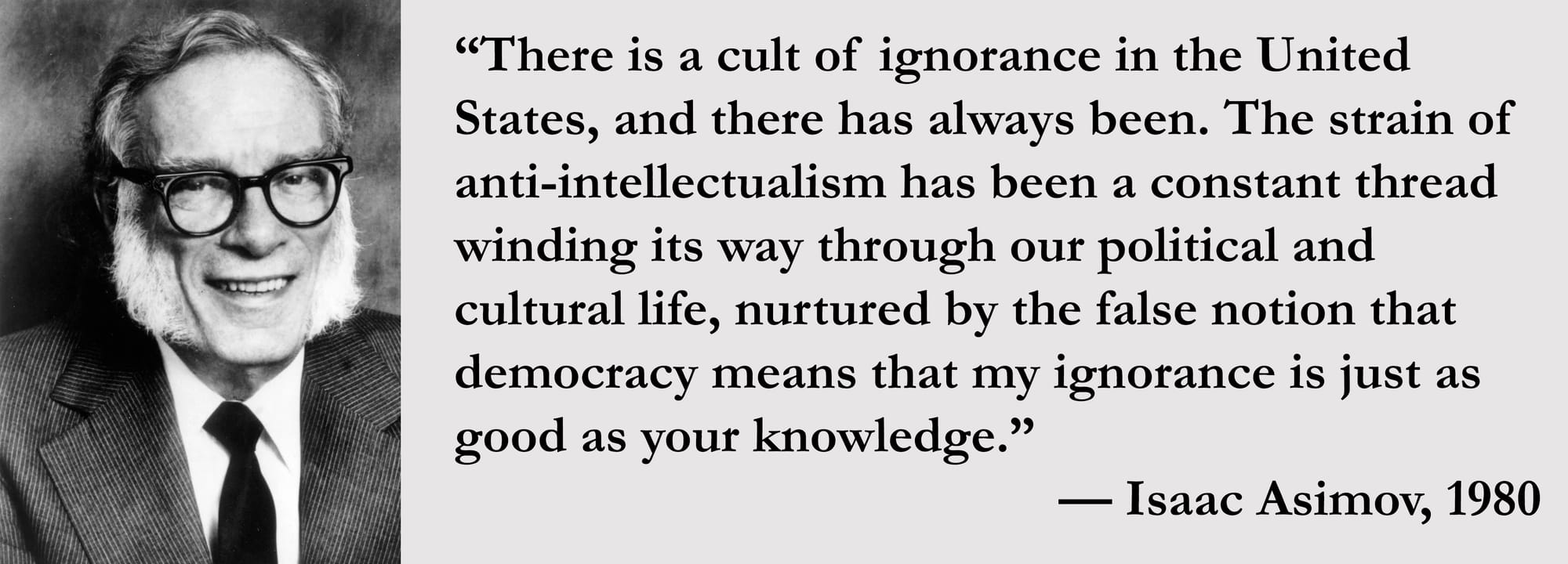 Once a society decides that everyone can be an instant expert, there is no longer a need to put true experts in decision-making positions. You can end up with a failed businessman and reality TV show star as President, a science denying former cokehead and heroin addict as Director of Health and Human Services, a hard-drinking wife-beating sexual predator as Secretary of Defense, a former wrestling entertainer running the Department of Education, and a longtime Russian asset and apologist as Director of National Security.