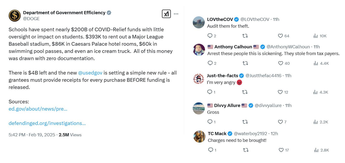 Big numbers are great for generating outrage among stupid people, who have no comprehension of relative magnitude of numbers. In the DOG tweet example above, consider it would read if all of the numbers were divided by a million, to make them easier to understand while maintaining their relative magnitude: "Schools have spent nearly $200K of COVID-Relief funds with little oversight or impact on students. 39.3 cents to rent out a Major League baseball stadium, 8.6 cents in Caesars Palace hotel rooms, 6 cents in swimming pool passes, and even an ice cream truck." In other words, in a budget of $200,000, they could only found about 50 cents of spending they don't agree with. And they're OUTRAGED!