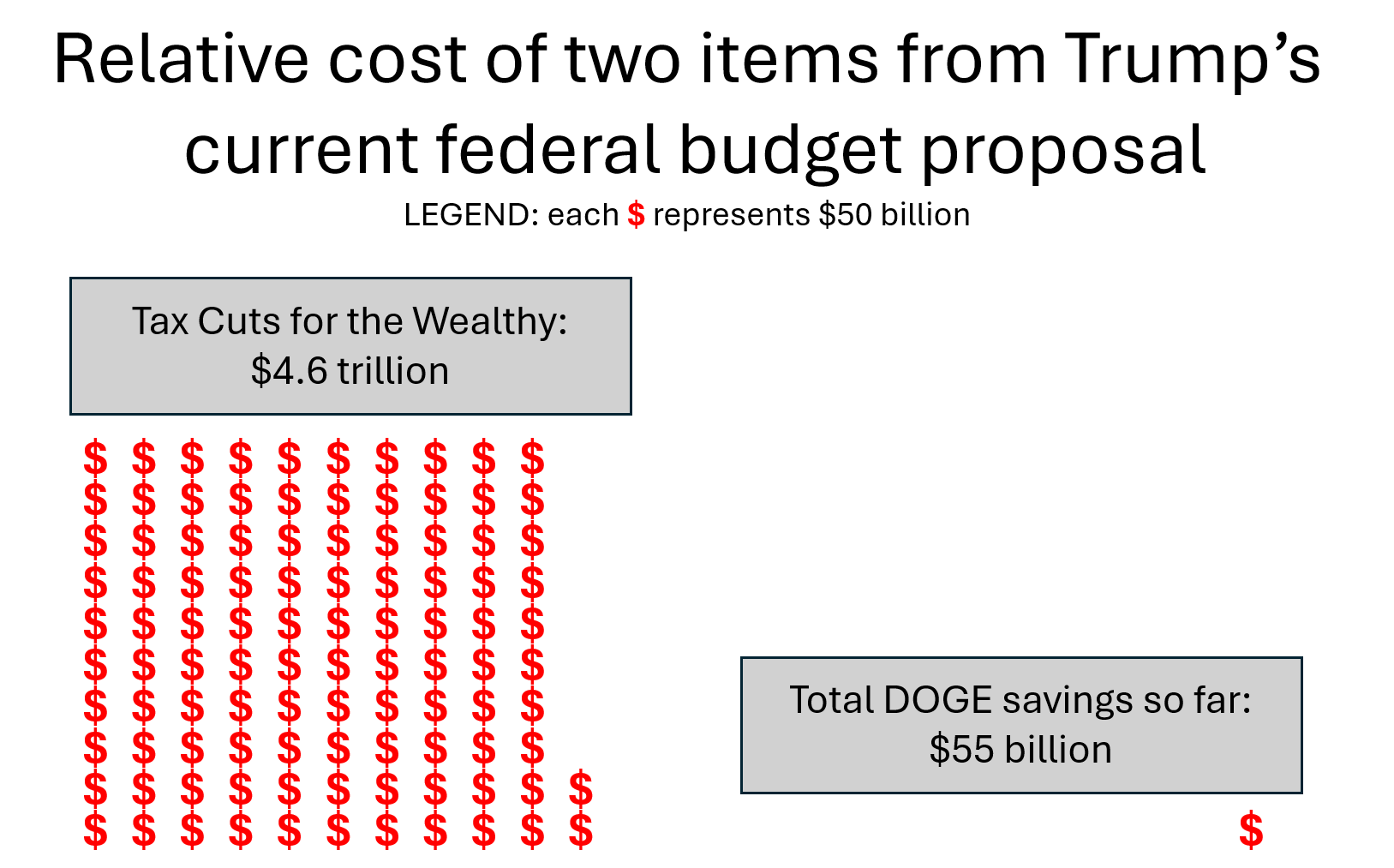 Speaking of DOGE, it's interesting to look at how it's doing after its first month of operation. According to a report released last year by the Congressional Budget Office (CBO), the cost of extending the Trump tax cuts for individuals making over $400K per year (as his current budget proposal does) would be $4.6 trillion over the next 10 years. And according to the DOGE website, as of this week they've found $55 billion in savings. Many people dispute that number, but let's take them at their word. Here's a chart that shows how these two numbers compare.